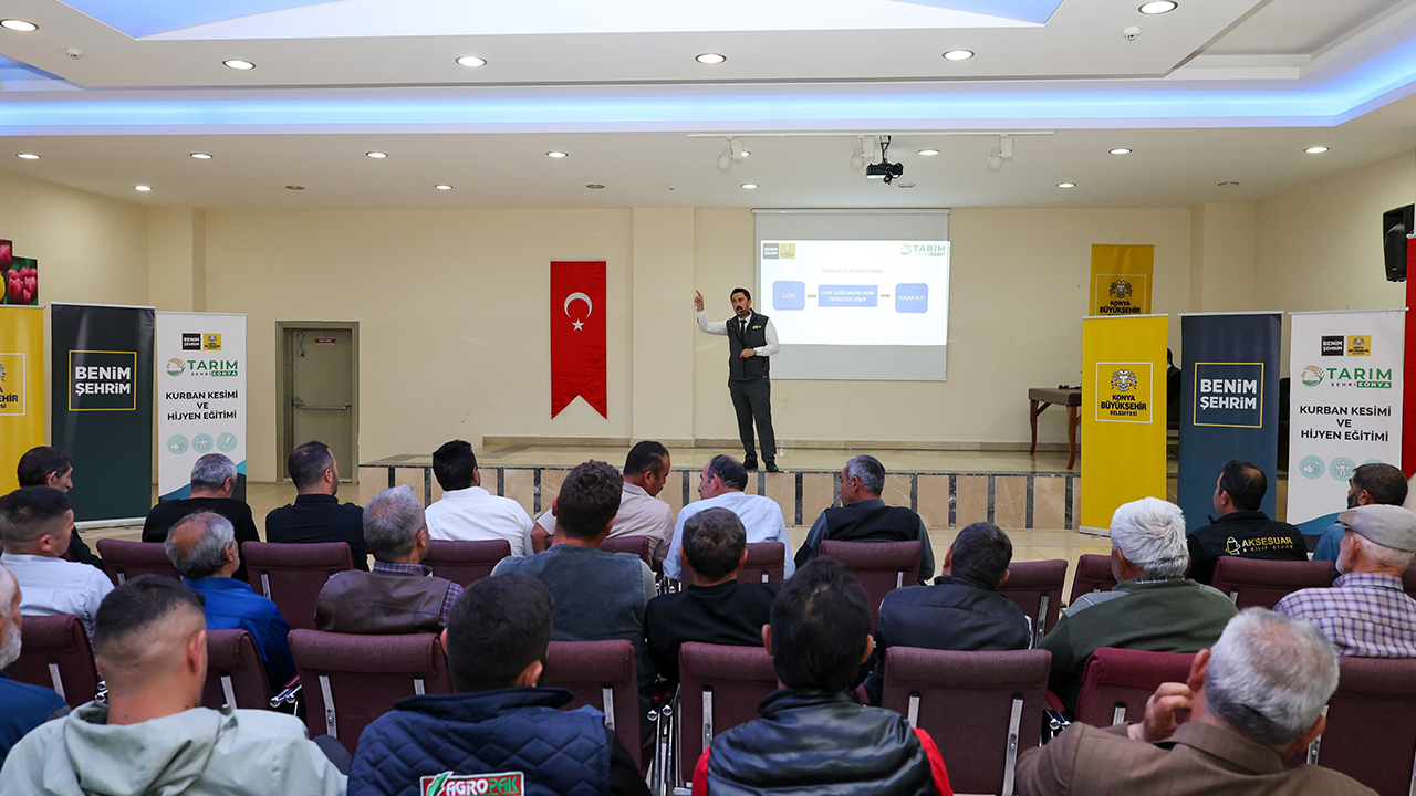 Kurban Bayramı öncesi özellikle hayvancılığın yoğun olarak yapıldığı bölgelerde saha çalışmalarıyla belirlenen alanlarda toplu eğitim programları düzenleyen Konya Büyükşehir Belediyesi, bu kapsamda Saraçoğlu Sosyal Tesisi’nde Karatay ilçesine bağlı 10 mahalleden yaklaşık 250 vatandaşa eğitim verdi.