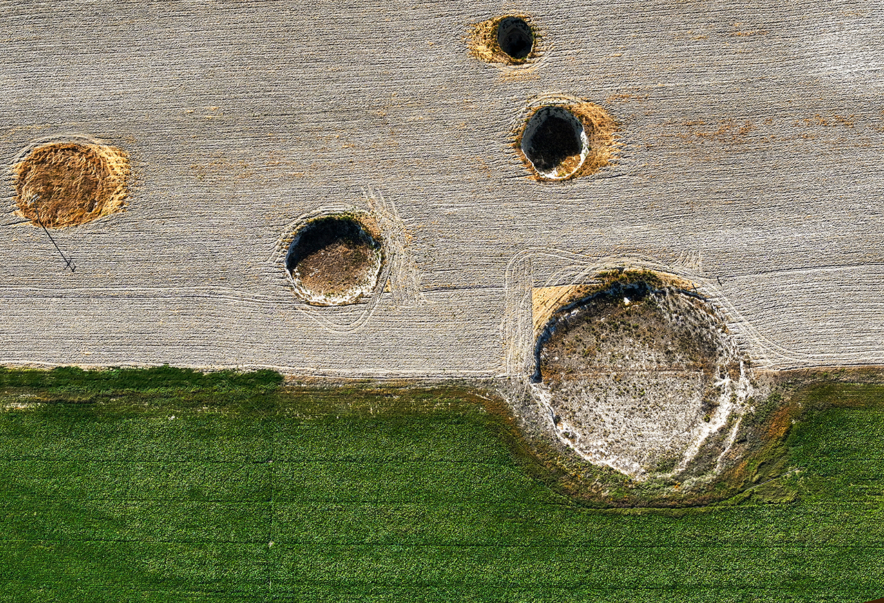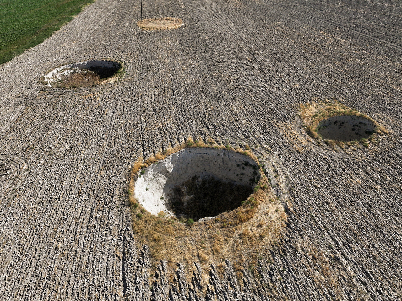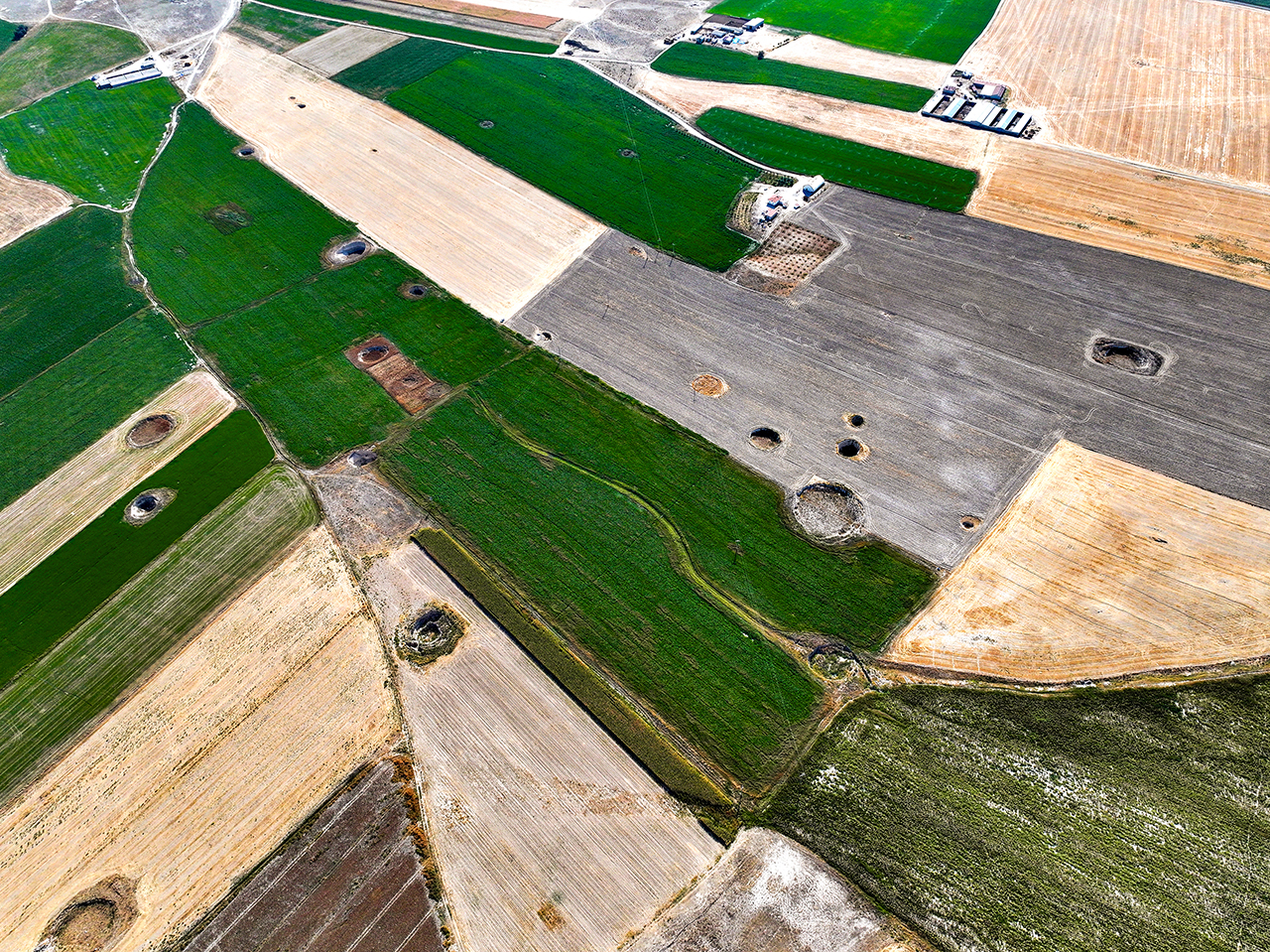 İki obruk arasının 5 metreye kadar düştüğü, çap ve derinlikleri farklı 100'den fazla çöküntünün olduğu yerde havadan çekilen fotoğraf karesine 24 obruk giriyor.