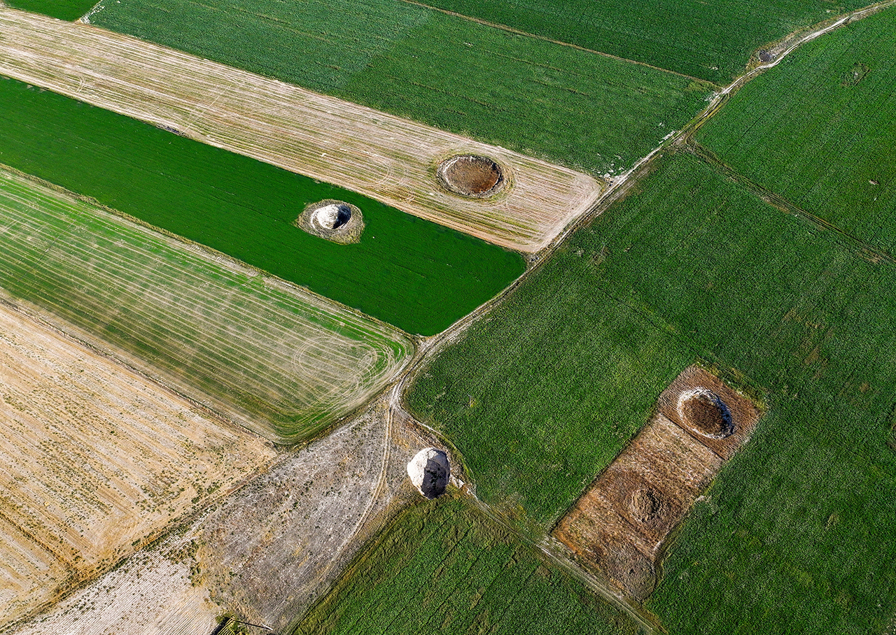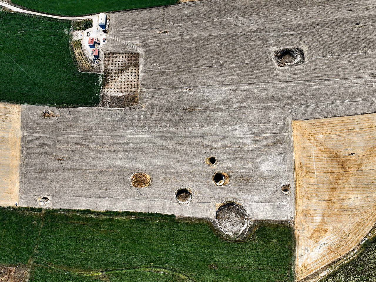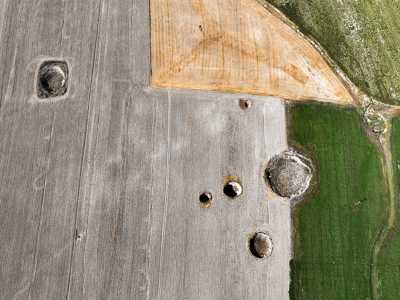 İki obruk arasının 5 metreye kadar düştüğü, çap ve derinlikleri farklı 100'den fazla çöküntünün olduğu yerde havadan çekilen fotoğraf karesine 24 obruk giriyor.