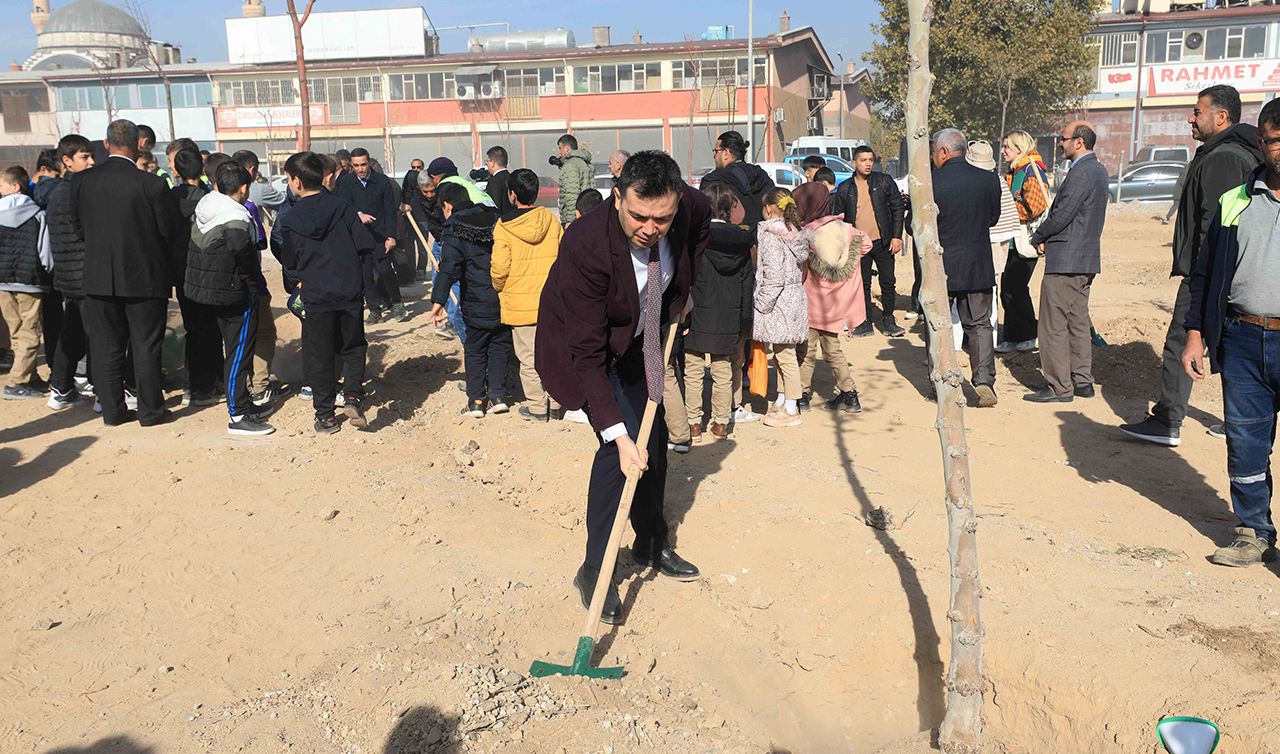Konuşmaların ardından protokol üyeleri ve öğrenciler fidanları toprakla buluşturdu.