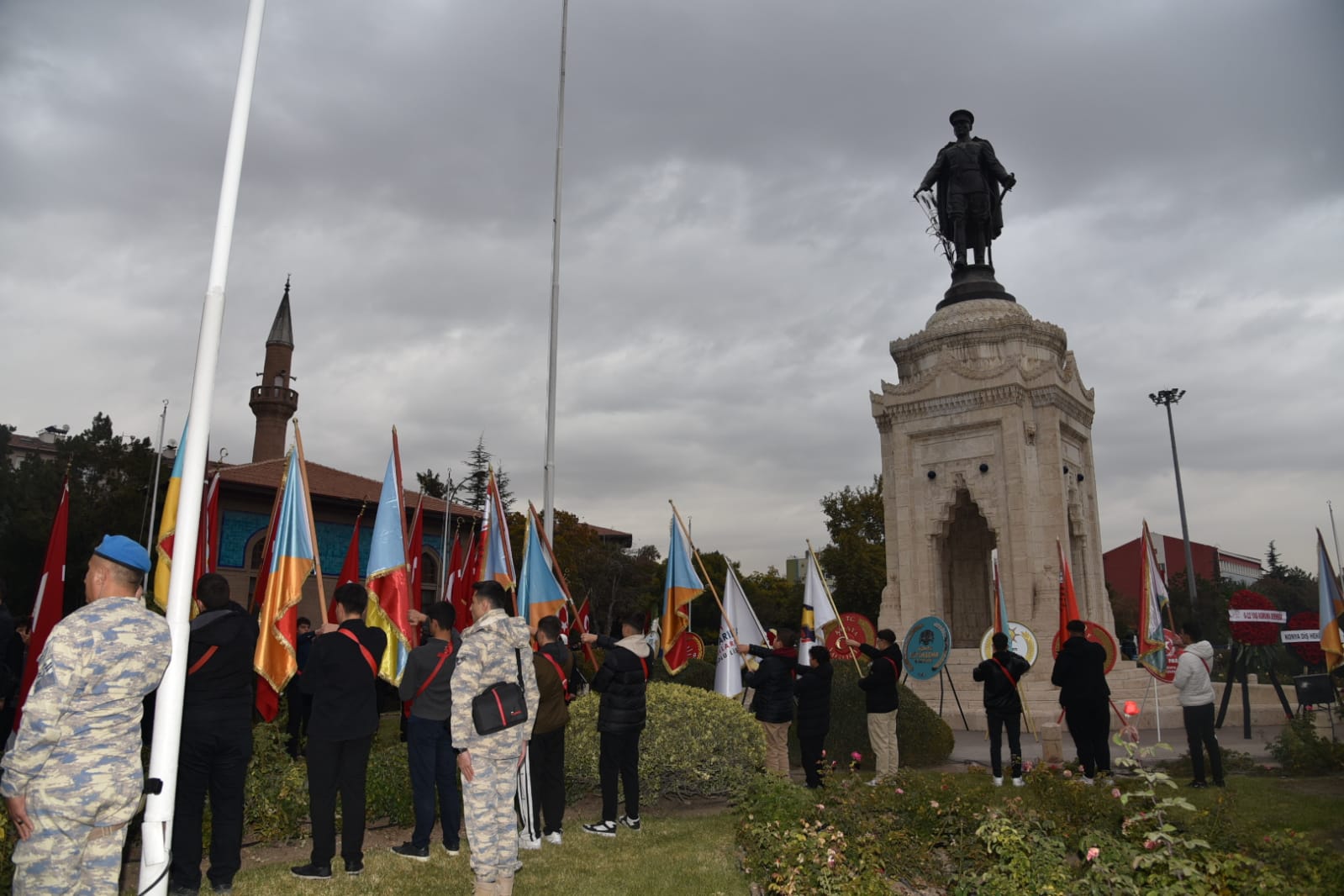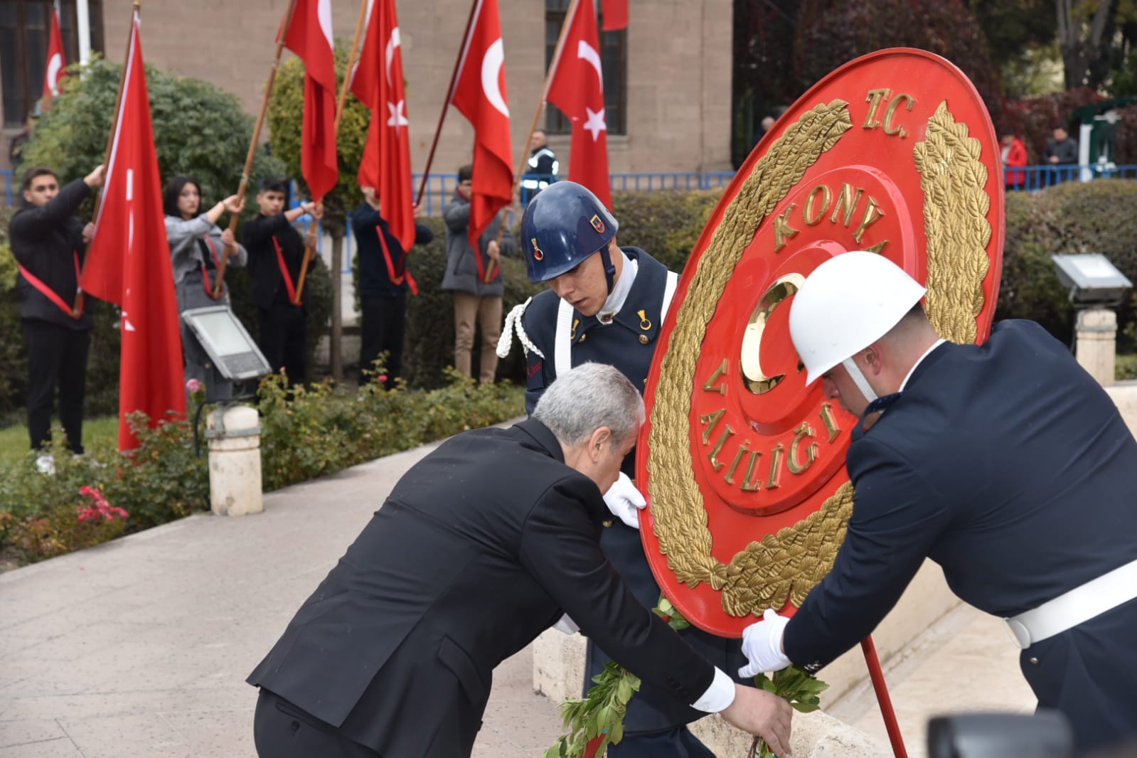 Tören, Atatürk Anıt Alanı'na Konya Valiliği, Konya Garnizon Komutanlığı ve Konya Büyükşehir Belediye Başkanlığı ile siyasi parti ve çeşitli sivil toplum kuruluşlarının çelenklerinin sunulmasıyla başladı.