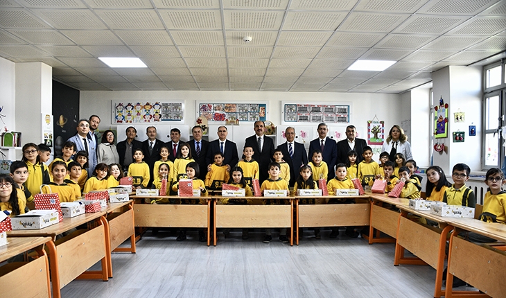 Protokol üyeleri öğrencilere başarılar dileyerek karnelerini ve hediyelerini verdi.