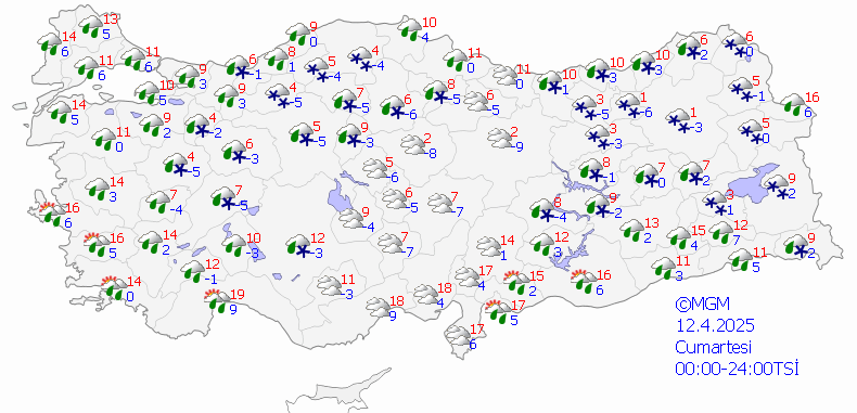 12 Nisan 2025 (Bugün) için Konya hava durumu Kar yağışlı, sıcaklık 12°