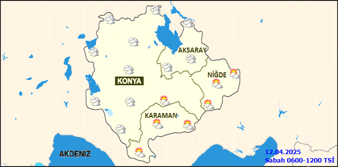 Meteorolojinin son hava tahmin raporuna göre hava sıcaklığının en yüksek 12 derece olması beklenen Konya'da havanın bugün (12 Nisan Cumartesi) bölge genelinin parçalı ve çok bulutlu, akşam saatlerinden sonra aralıklı kar yağışlı geçeceği tahmin ediliyor.