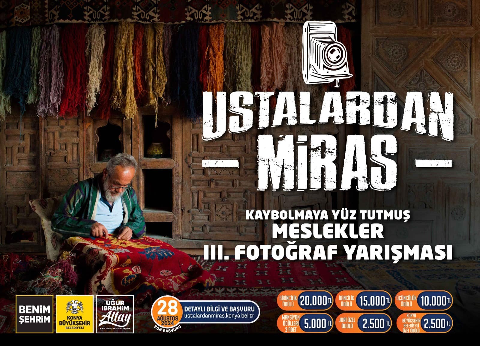Konya Büyükşehir Belediyesi, yok olma tehlikesiyle karşı karşıya kalan geleneksel mesleklerin yaşatılması ve sonraki kuşaklara aktarılması amacıyla 3. “Ustalardan Miras, Kaybolmaya Yüz Tutmuş Meslekler” temalı ödüllü fotoğraf yarışması düzenliyor. Yarışmaya son başvuru tarihi 28 Ağustos.