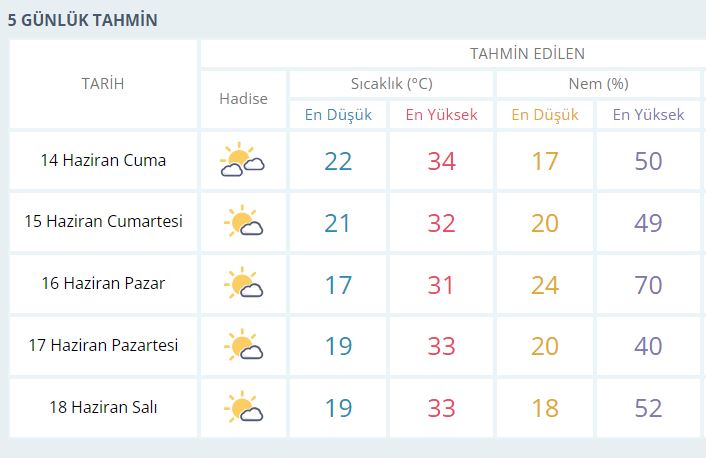 Meteorolojiden alınan bilgiye göre bugün (14 Haziran Cuma) sıcaklık en yüksek 34 dereceyi görmesi bekleniyor. Arife günü (15 Haziran Cumartesi) ise sıcaklıklar biraz daha mevsim normallerine yaklaşacak olup, sıcaklığın 32 derece olması bekleniyor. Bayramın birinci günü (16 Haziran Pazar) sıcaklık 31 derece, Bayramın ikinci günü (17 Haziran Pazartesi) 33 derece, Bayramın üçüncü günü (18 Haziran Salı) 33 dereceyi görmesi bekleniyor. Öte yandan bayramın 3.günü ve 4.günü bazı ilçelerde yağışların etkili olması ön görülüyor. (Yunus Köroğlu)