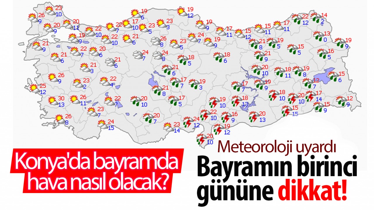 Meteoroloji tarafından yapılan son tahminlere göre hava sıcaklığının en yüksek 16 derece olması beklenen 9 Nisan arefe günü ile bayramın birinci günü olan 10 Nisan Çarşamba günü Konya'da sağanak yağış bekleniyor. Bayramın ikinci günü ise yağış beklenmezken, havanın parçalı bulutlu olması tahmin ediliyor. Bayramın üçüncü günü ise havanın güneşli olması bekleniyor. Bayramın ilk günü günün en yüksek sıcaklık değeri ise kentte 20 civarında seyredecek.