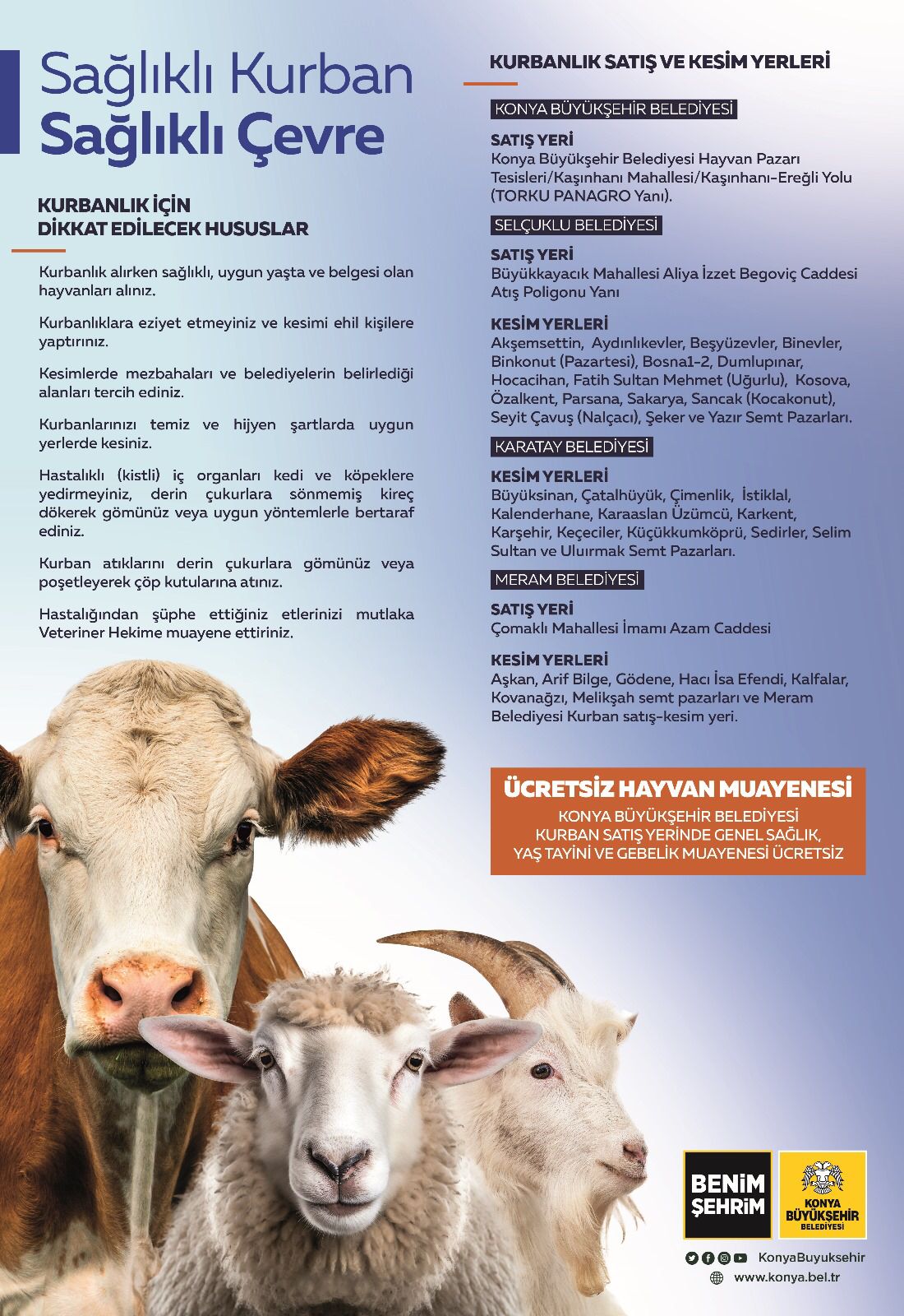 Konya Büyükşehir Belediyesi, Kurban Bayramı için gerekli tedbirleri aldı. Konya’da toplu ulaşım araçları bayramın birinci günü ücretsiz, diğer günler yüzde 50 indirimli hizmet verecek. KONPARK’a ait tüm otoparklar arefe günü ve bayramda ücretsiz olacak. Yeni hayvan pazarına ulaşmak isteyen Konyalılar için toplu ulaşımda aktarma seferleri başlatıldı. Hayvan pazarında hayvanların ücretsiz genel muayenesi, yaş tayini, ultrason ile gebelik testi hizmeti verilirken; bayramda kurban etleriyle ilgili ücretsiz et muayenesi yapılacak.