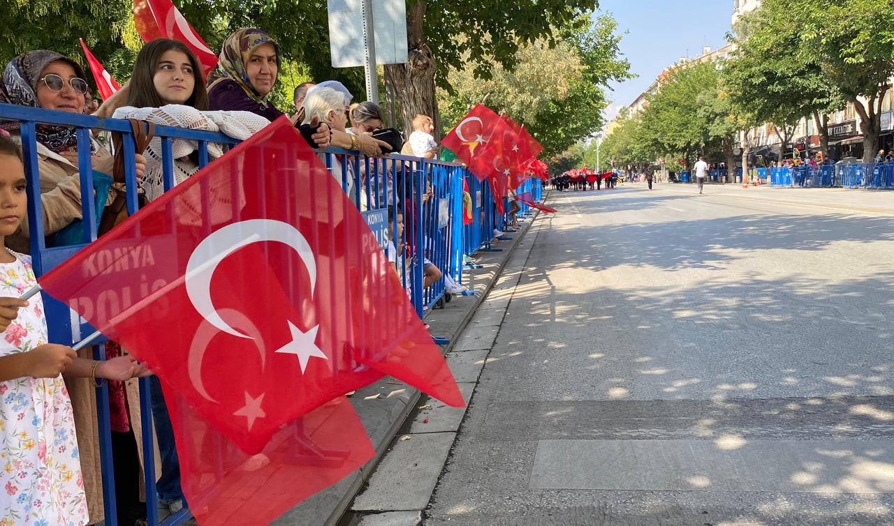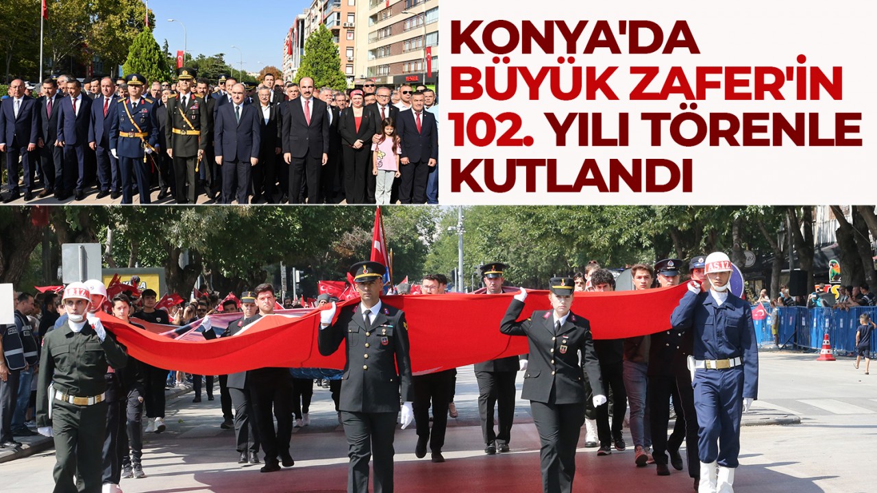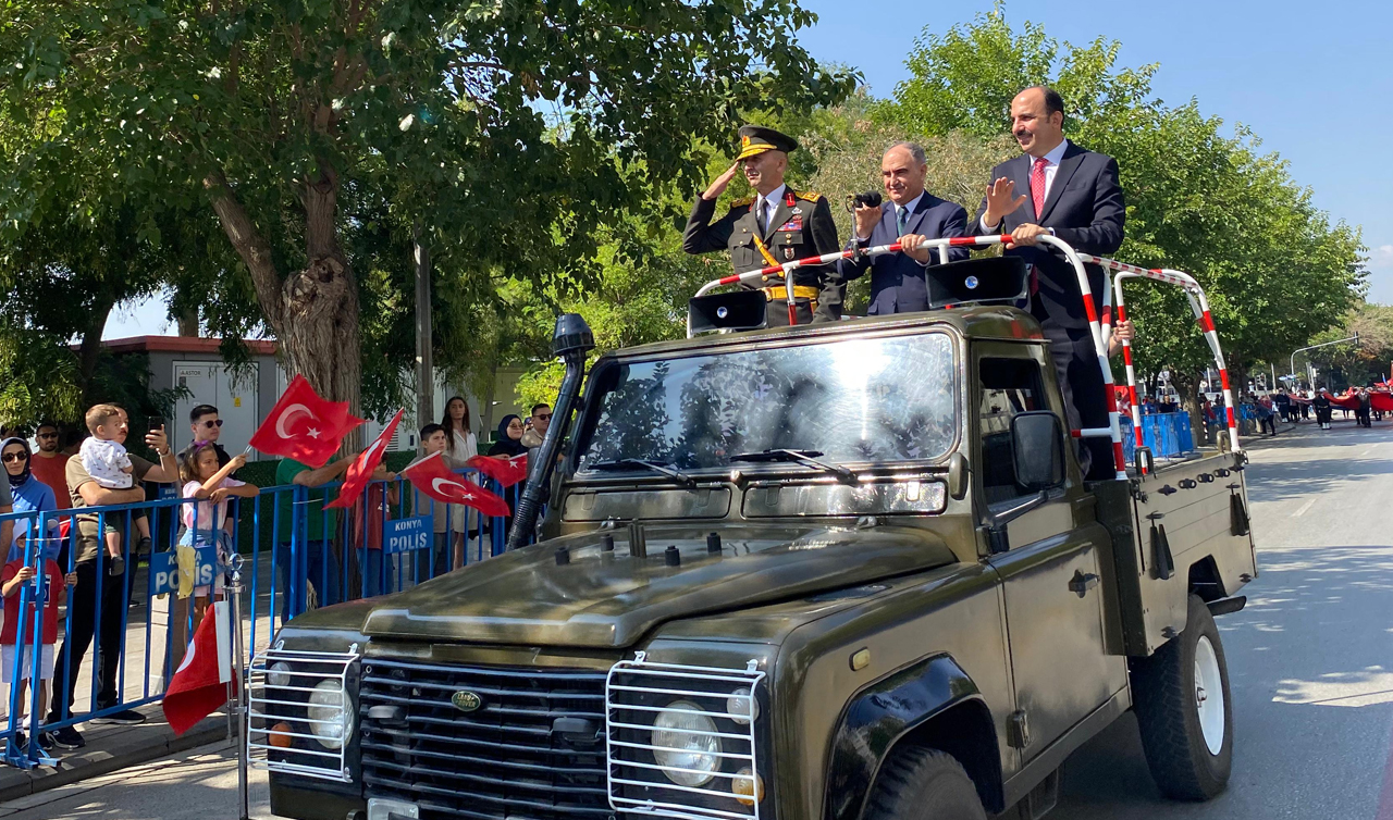 Konya'daki törenler, Atatürk Anıtı'na çelenk sunumuyla başladı. Ferit Paşa Caddesi'nde devam eden törende, Vali Vahdettin Özkan, askeri araçla halkı selamladı. Yapılan konuşma ve şiirlerin okunmasıyla devam eden törende, halk oyunları ekipleri çeşitli gösteriler yaptı. Program, geçit töreninin ardından sona erdi.