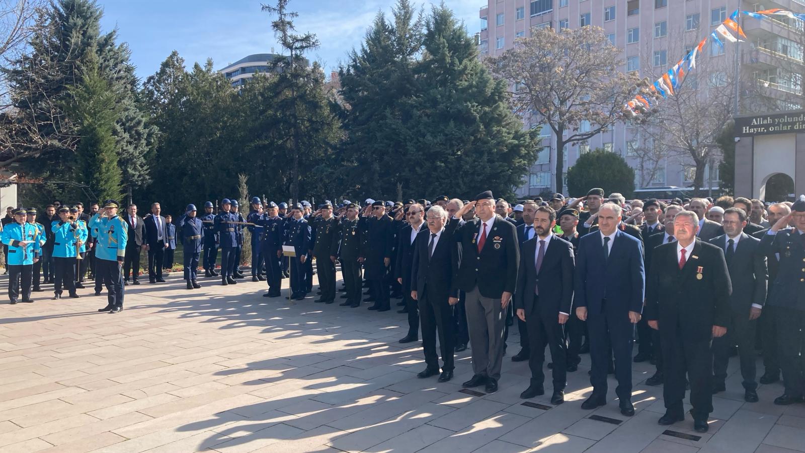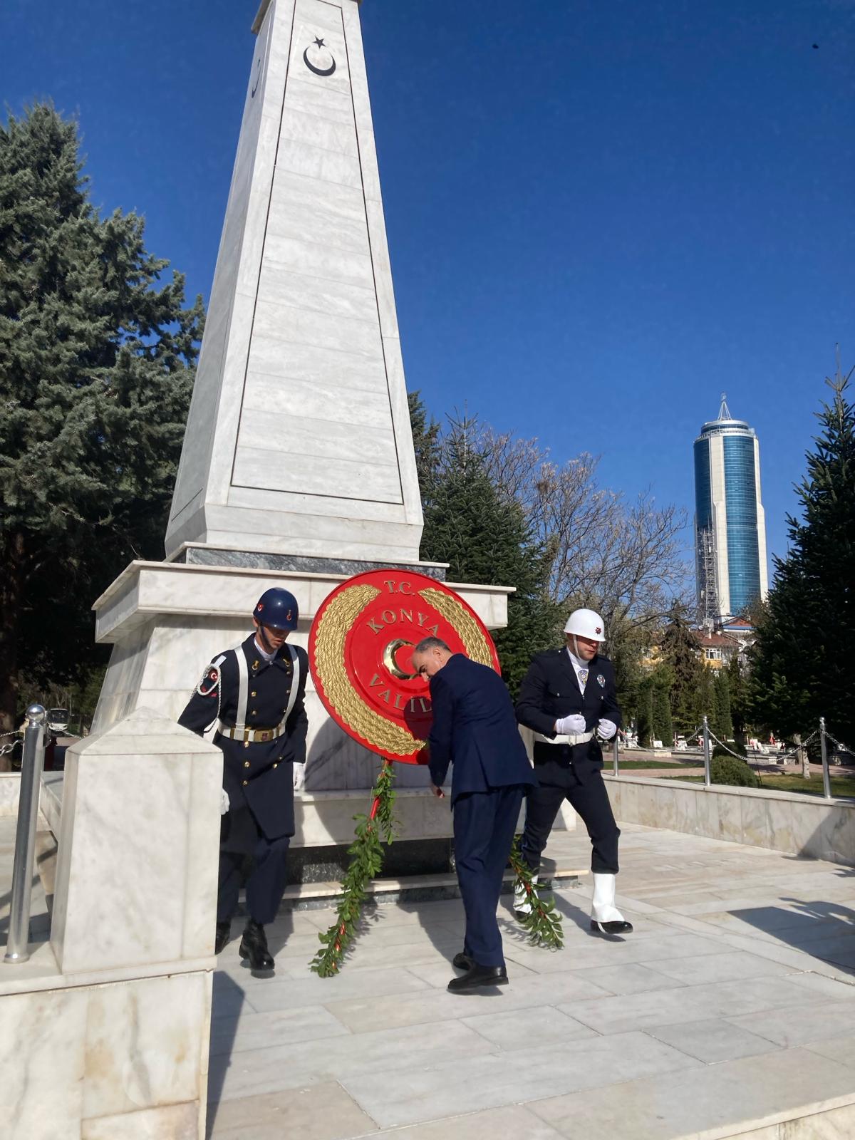 Konya'da Musalla Mezarlığı'ndaki Şehitler Anıtı'na Valilik, Konya Büyükşehir Belediyesi, Türkiye Harp Malulü Gaziler Şehit Dul ve Yetimleri Derneği ile Konya Şehit Aileleri Derneği çelenkleri sunuldu.
