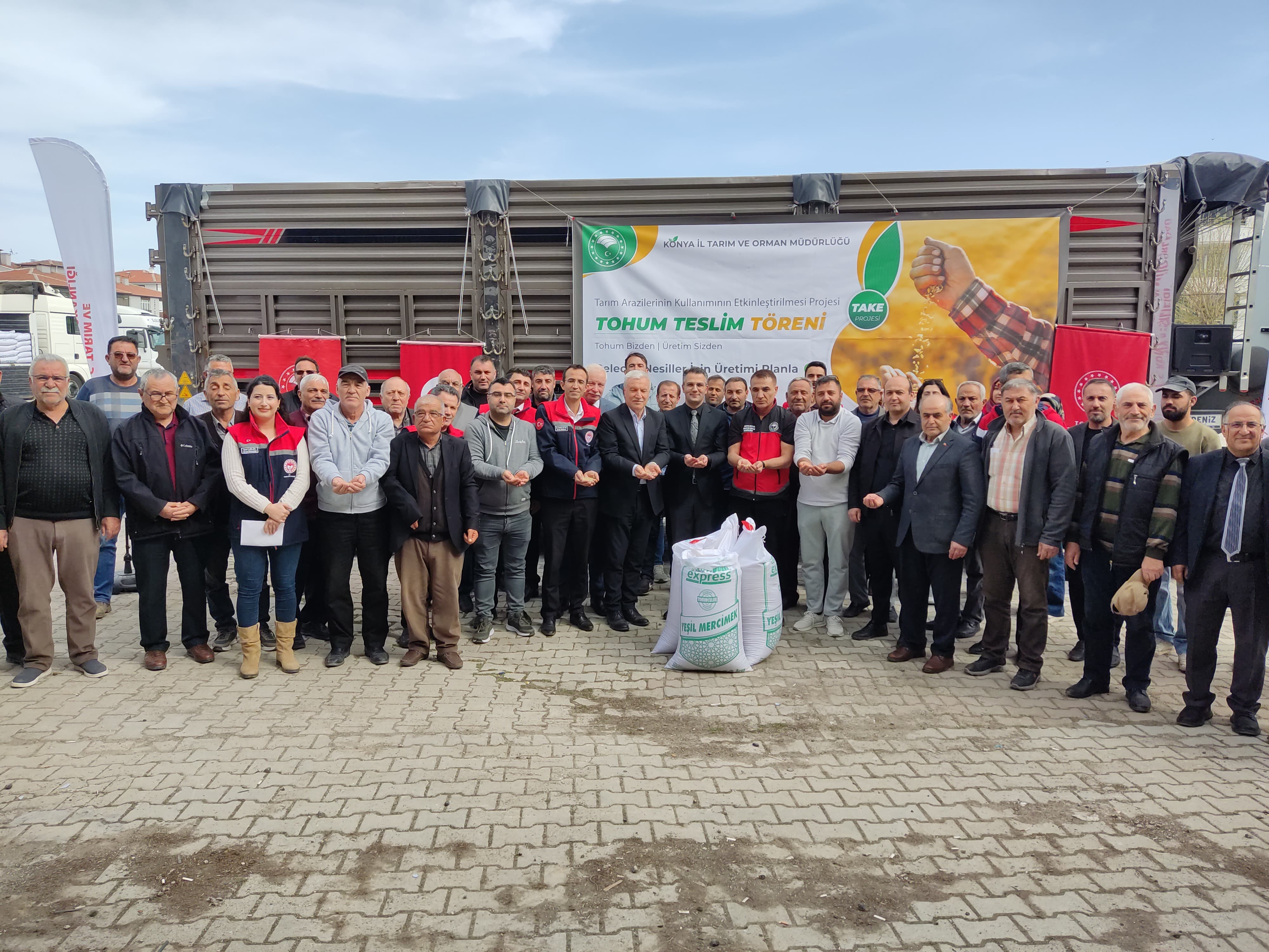 Sadece bu yeşil mercimekle de sınırlı kalmayacak. Saymış olduğumuz stratejik ürünlerden özellikle kıraç araziler de ekimi gerçekleştirilen nohutta devam edecek yine yağlık ayçiçeği ile devam edeceğiz ve yine buralarda kümelenmiş olan Cihanbeyli ve Kulu ilçemize kimyon bitkisi ile de dağıtımımız devam etmiş olacak. Amacımız üreticilerimizin bir nebze de olsa tohum ihtiyacını karşılayabilmek az su tüketen ve kıraç şartlarda yetişen ürünlerin ekiliş alanlarını arttırmak yine bu dağıtmış olduğumuz tohumlar tamamen yerli ve milli tohumlarımız sertifikalı tohumlarımız aynı zamanda sertifikalı tohumculuğu desteklemek ülke ve şehir ekonomisine katkı sunmayı hedefliyoruz. Bu tohumların hem şehrimize hem ilçemize hem ülkemize hayırlı ve bereketli olmasını diliyorum. ‘’ dedi.