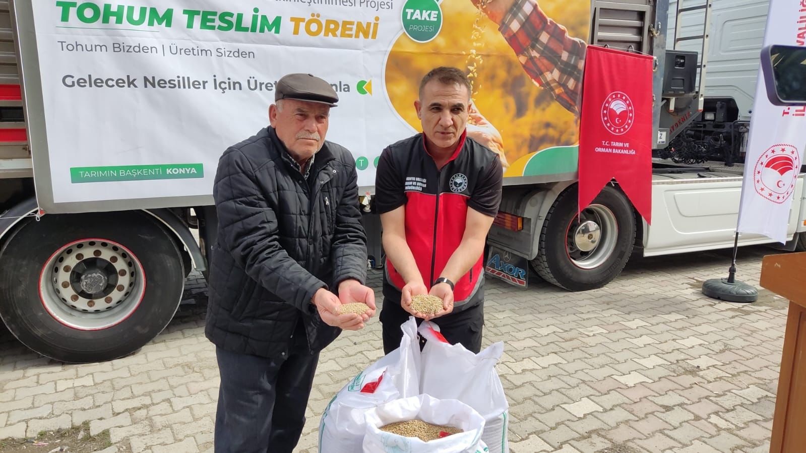 Konya'nın Kulu ilçesinde, Konya İl Tarım ve Orman Müdürlüğü tarafından yürütülen "Yeşil Mercimek ile Toprağı Kazan Projesi" kapsamında çiftçilere yüzde 75 hibeli 73 ton sertifikalı yeşil mercimek tohumu dağıtıldı.