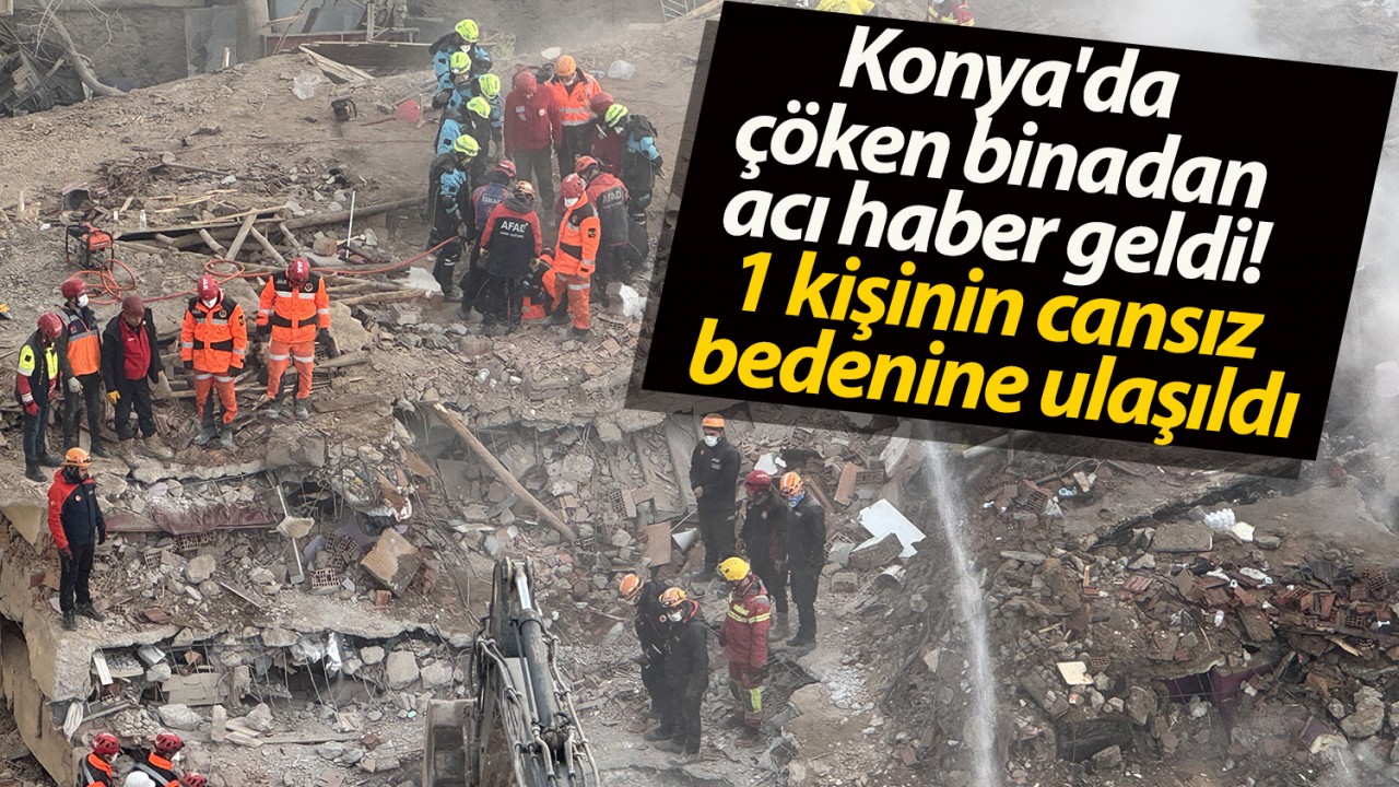 Konya'da çöken 4 katlı binanın enkazındaki arama kurtarma çalışmaları yaklaşık 12 saattir aralıksız devam ediyor. Enkaz altında kalan 5 kişiden 3'ü sağ olarak kurtarıldı. Bir kişinin ise cansız bedenine ulaşıldı.