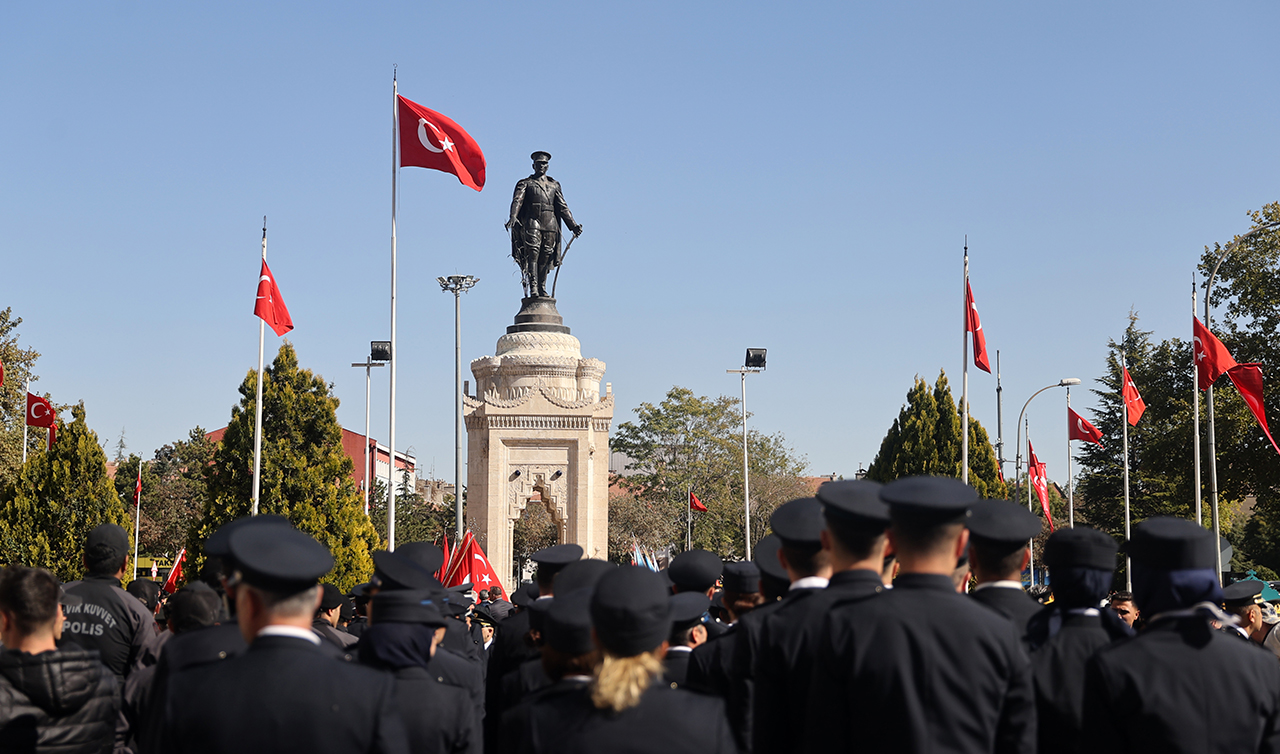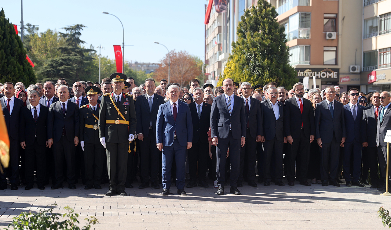 Konya Anıt Meydanı'ndaki Atatürk Anıtı önündeki törende Vali İbrahim Akın, Garnizon Komutanı Tümgeneral Emre Tayanç ve Büyükşehir Belediye Başkanı Uğur İbrahim Altay, anıta çelenk bıraktı. Saygı duruşunda bulunulmasının ardından İstiklal Marşı okundu. Törene çok sayıda kişi katıldı.