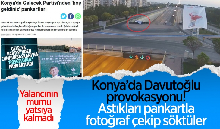 Cumhurbaşkanı Erdoğan’ın Konya’ya gelişi öncesi provokasyon çabası içerisinde olan Ahmet Davutoğlu ekibinin yalanı, mobese görüntüleriyle açığa çıktı. Köprüye astıkları pankartı, fotoğraf çektikten sonra söken Gelecek Partililer “Afişimiz kaldırıldı” açıklamaları yaptı. Ortaya çıkan görüntülerle yalancının mumu yatsıya kalmadı.