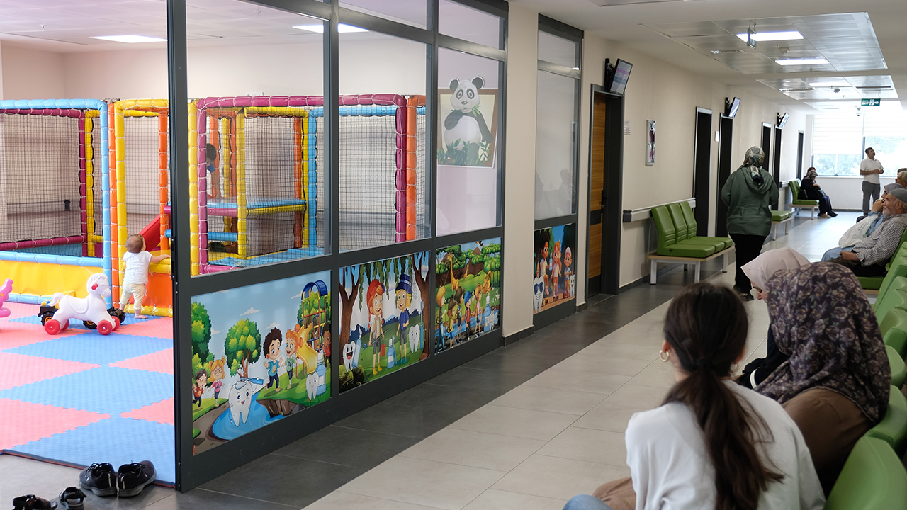 20'si çocuk 74 diş ünitesi bulunan hastanenin çocuk polikliniğinde, oyun alanları ve özel animasyonlar ile çocuk hastalar 'dişçi korku'larını aşıyor.