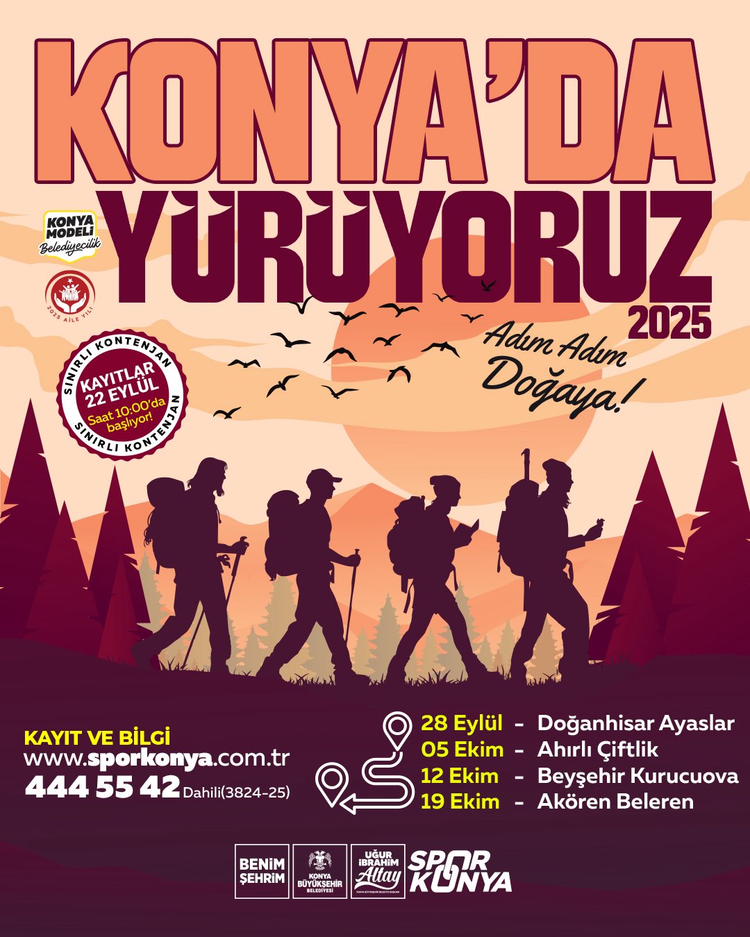 KONYA’DA YÜRÜYORUZ – Adım Adım Doğaya Konya Büyükşehir Belediyesi tarafından düzenlenen doğa yürüyüşleri başlıyor. Şehrin doğal güzelliklerini keşfetmek, doğayla iç içe keyifli bir gün geçirmek isteyen herkesi yürüyüşlerimize bekliyoruz. Yürüyüş Takvimi ve Parkurlar: 28 Eylül – Doğanhisar Ayaslar 6 km, Kolay Parkur 05 Ekim – Ahırlı Çiftlik 6,3 km, Kolay Parkur 12 Ekim – Beyşehir Kurucuova 7 km, Kolay Parkur 19 Ekim – Akören Beleren (Mavi Boğaz) Keykubad Göç ve Kervan Yolu 12 km, Zor Parkur