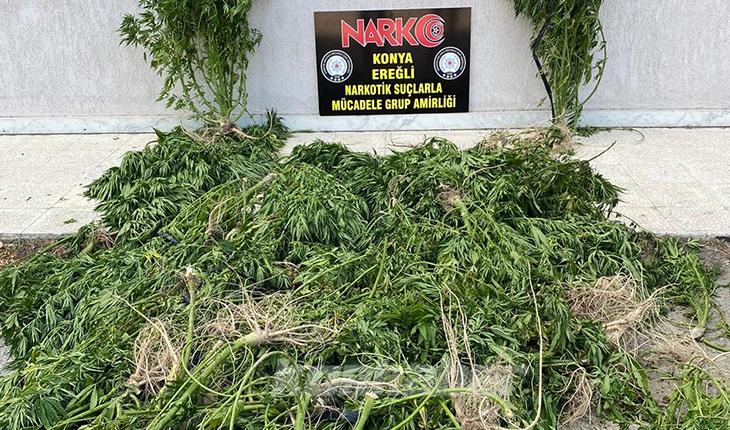 Konya’nın Ereğli ilçesinde polisin zehir tacirlerine yönelik yaptığı operasyonda domates tarlasında 68 kök Hint keneviri ele geçirildi.