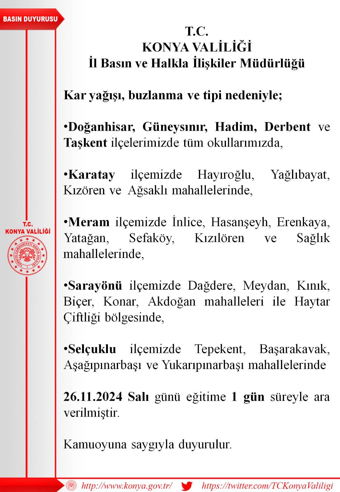 Karatay ilçesinde Hayıroğlu, Yağlıbayat, Kızören ve Ağsaklı mahalleleri, Meram ilçesinde İnlice, Hasanşeyh, Erenkaya, Yatağan, Sefaköy, Kızılören ve Sağlık mahalleleri, Sarayönü ilçesinde Dağdere, Meydan, Kınık, Biçer, Konar, Akdoğan mahalleleri ve Haytar Çiftliği bölgesi, Selçuklu ilçesinde Tepekent, Başarakavak, Aşağıpınarbaşı ve Yukarıpınarbaşı mahallelerinde 26 Kasım Salı günü eğitime 1 gün ara verildi.