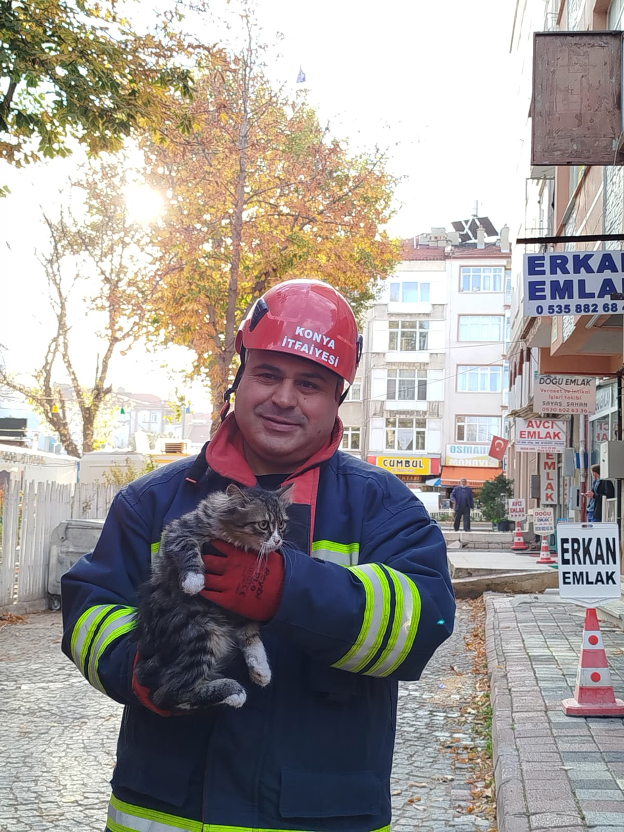 Konya'nın Akşehir ilçesinde ağaçta mahsur kalan kedi, itfaiye ekiplerince kurtarıldı.