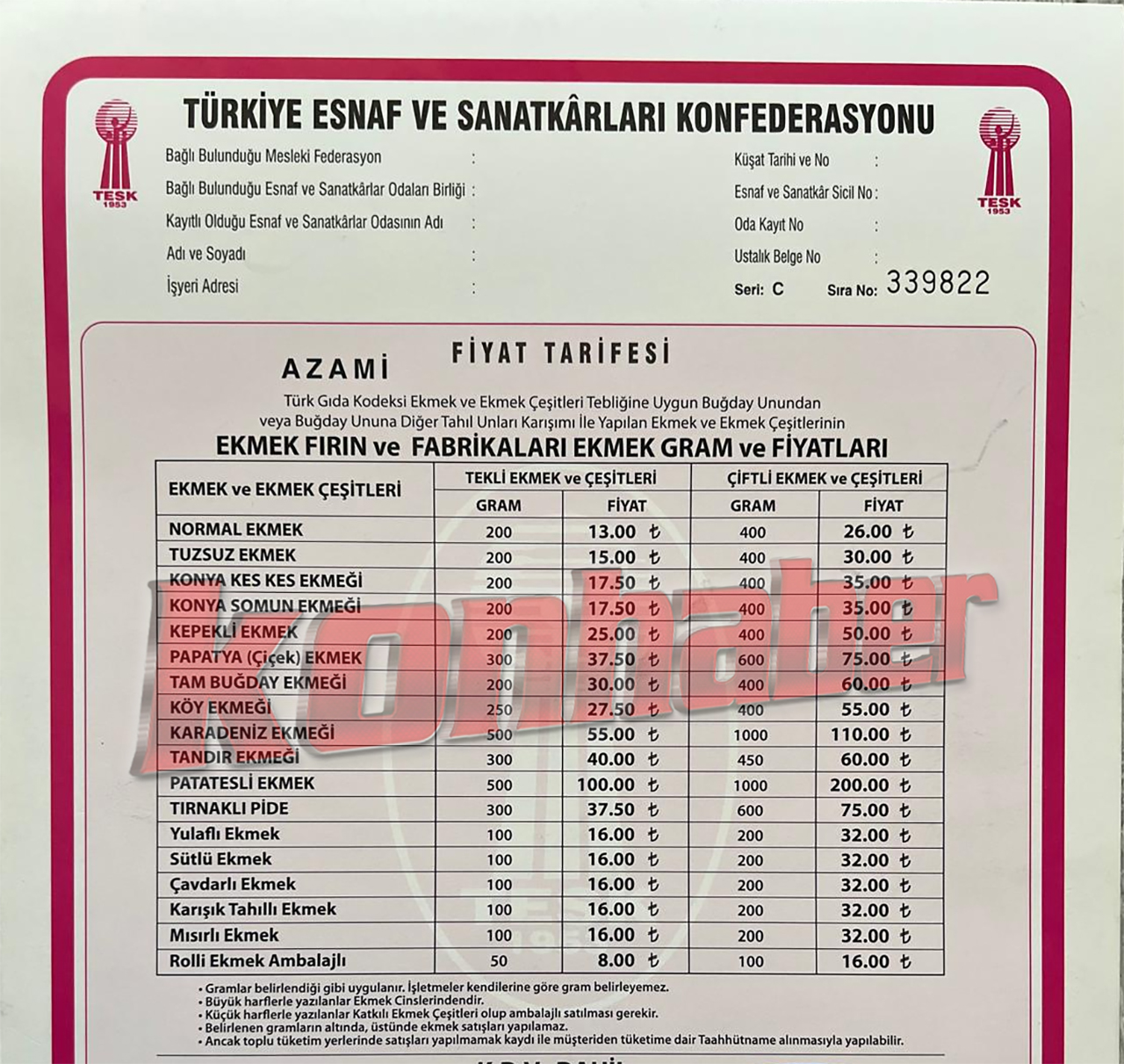 Konuyla ilgili Konya Fırıncılar Odasından yapılan açıklamada, "Fırıncı esnaflarımızın maliyetlerinin artması sebebiyle fiyatlarının yeniden güncellenmesi talepleri doğrultusunda Fiyat Tesbit Komisyonuna müracaatımız üzerine toplantı neticesinde 200 gram pişmiş ekmek fiyatı 13,00 TL. Olarak belirlenmiştir. Yeniden güncellenen Ekmek fiyatları 21 Ekim Salı günü itibari ile satışa sunulacak" denildi.