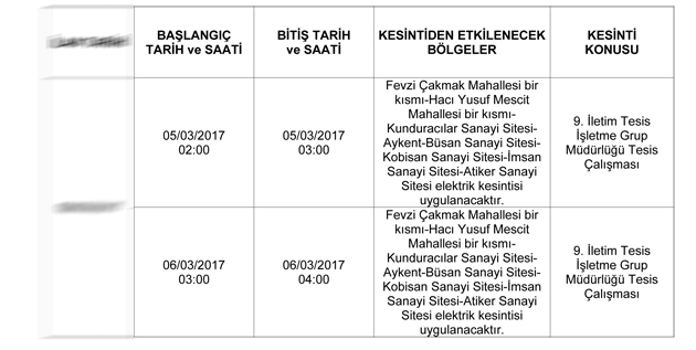 MEDAŞ'tan yapılan açıklamaya göre, Karatay'ın bazı bölgelerinde 5 mart 02:00-03:00 ve 6 mart 03:00-04:00 tarihlerinde elektrik kesintisinin uygulanacağı bildirildi.
