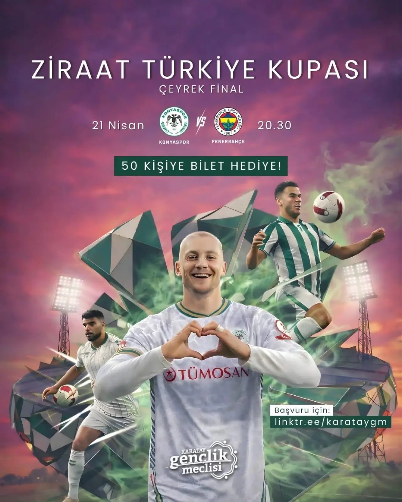 Karatay Gençlik Meclisi, Konyaspor – Fenerbahçe maçı öncesi gençlere ücretsiz bilet desteği sağlıyor. Başvuruda ilk 50 kişi, çeyrek final heyecanını tribünden yaşayacak. İşte başvuru linki ve tüm detaylar...