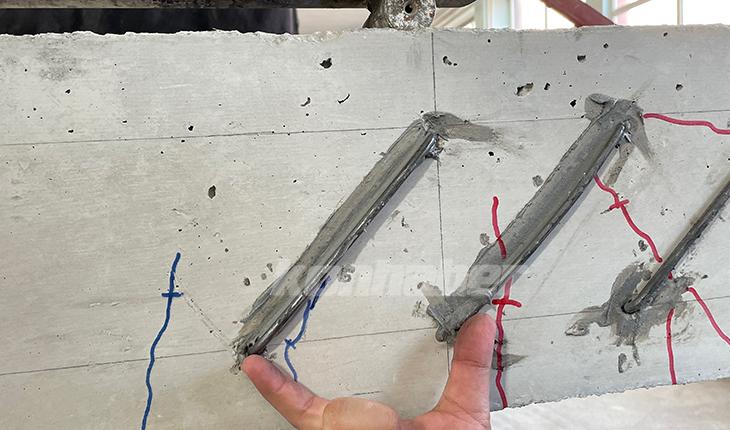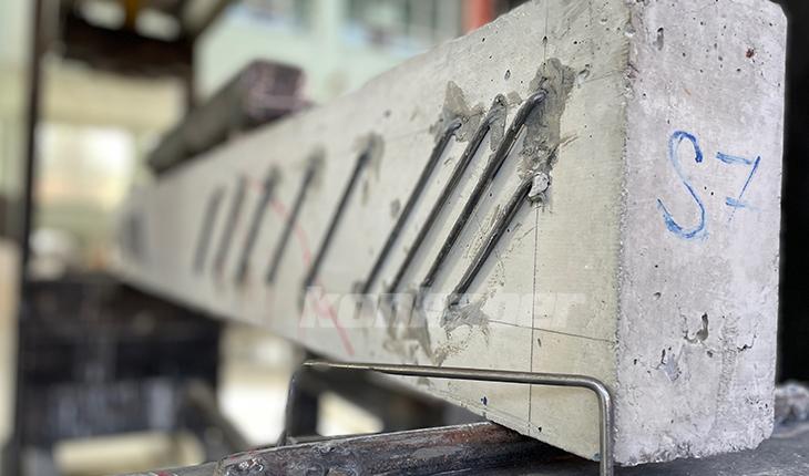 Betonarme elemanların güçlendirilmesinde farklı tekniklerin kullanıldığını aktaran Aksoylu, bunların içinde maliyeti en uygun olanının geliştirdikleri yöntem olduğunu bildirdi.- Kirişler çelik zımbalarla güçlendiriliyor