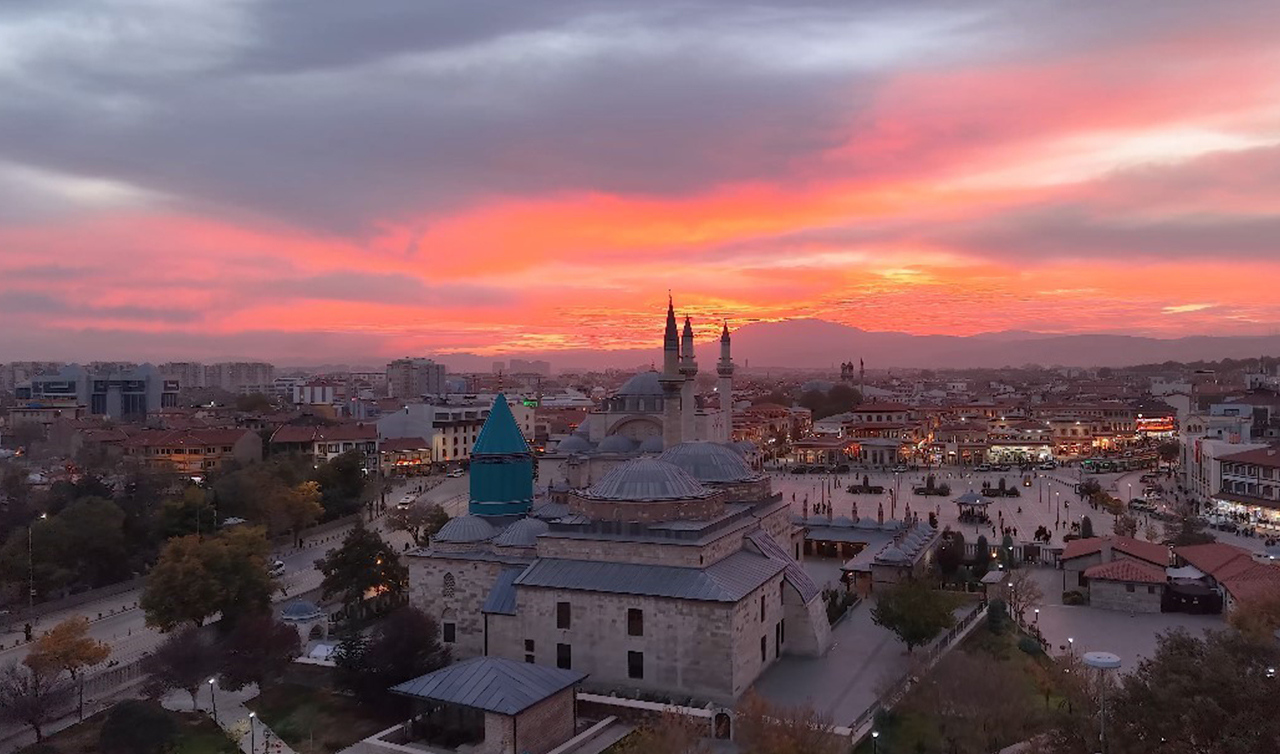 Farklı zaman dilimlerinde dron ile kaydedilen görüntülerde, Mevlana Müzesi ve Sultan Selim Camii'nden güneşin batışı, oluşan kızıllık, bulutlar, Konya'nın yeşil kubbesi Kubbe-i Hadra, Altın Çarşı ve Tarihi Bedesten Çarşısındaki binaların kartpostallık görüntüleri yer aldı.