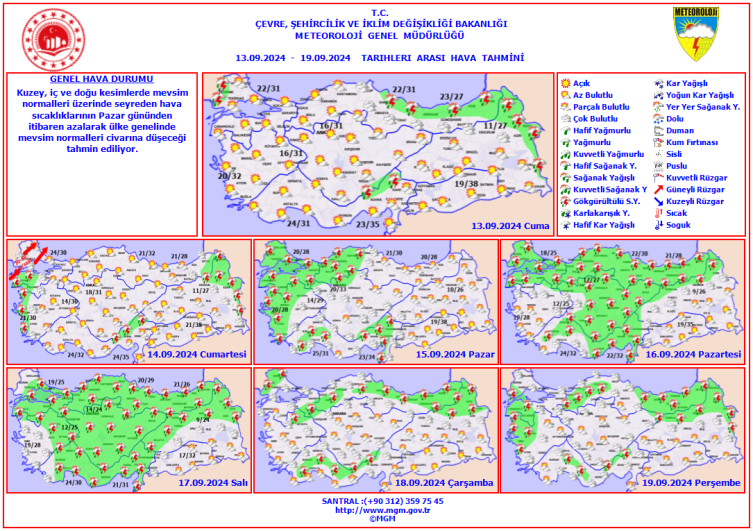 Meteoroloji Genel Müdürlüğü tarafından yapılan son tahminlere göre bugün yurdun kuzey ve doğu kesimlerinin parçalı yer yer çok bulutlu, Orta ve Doğu Karadeniz kıyıları, Artvin, Kars, Ardahan, Iğdır, Van'ın doğusu, Balıkesir'in batı ilçeleri ve Edirne çevreleri ile Doğu Akdeniz'in Toroslar mevkii ve Kahramanmaraş'ın batısının yerel olmak üzere sağanak ve gök gürültülü sağanak yağışlı, diğer yerleri az bulutlu ve açık geçeceği tahmin ediliyor.