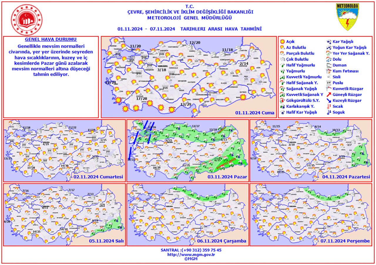 Genellikle mevsim normalleri civarında, yer yer üzerinde seyreden hava sıcaklıklarının, kuzey ve iç kesimlerde pazar günü azalarak mevsim normalleri altına düşeceği tahmin ediliyor.
