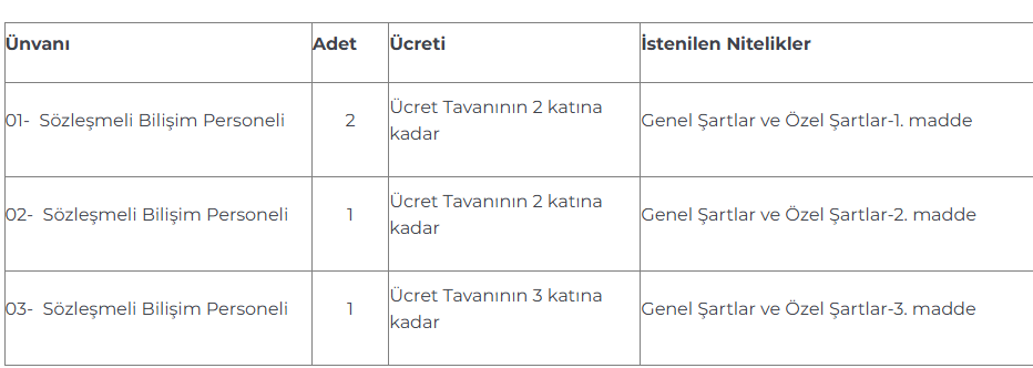 -Aylık brüt sözleşme ücret tavanının 3 (üç) katı ödenecek pozisyonlara başvuru yapmak üzere Kamu Kurum ve Kuruluşlarının Büyük Ölçekli Bilgi İşlem Birimlerinde Sözleşmeli Bilişim Personeli İstihdamına İlişkin Esas ve Usuller Hakkında Yönetmelik’in 6 ncı maddesinin (b) bendinde belirtilen alanlardan birinden; aylık brüt sözleşme ücret tavanının 2 (iki) katı ödenecek pozisyonlara başvuru yapmak üzere aynı yönetmeliğin 6 ncı maddesinin (b) veya (c) bendinde belirtilen alanlardan birinden mezun olmak.