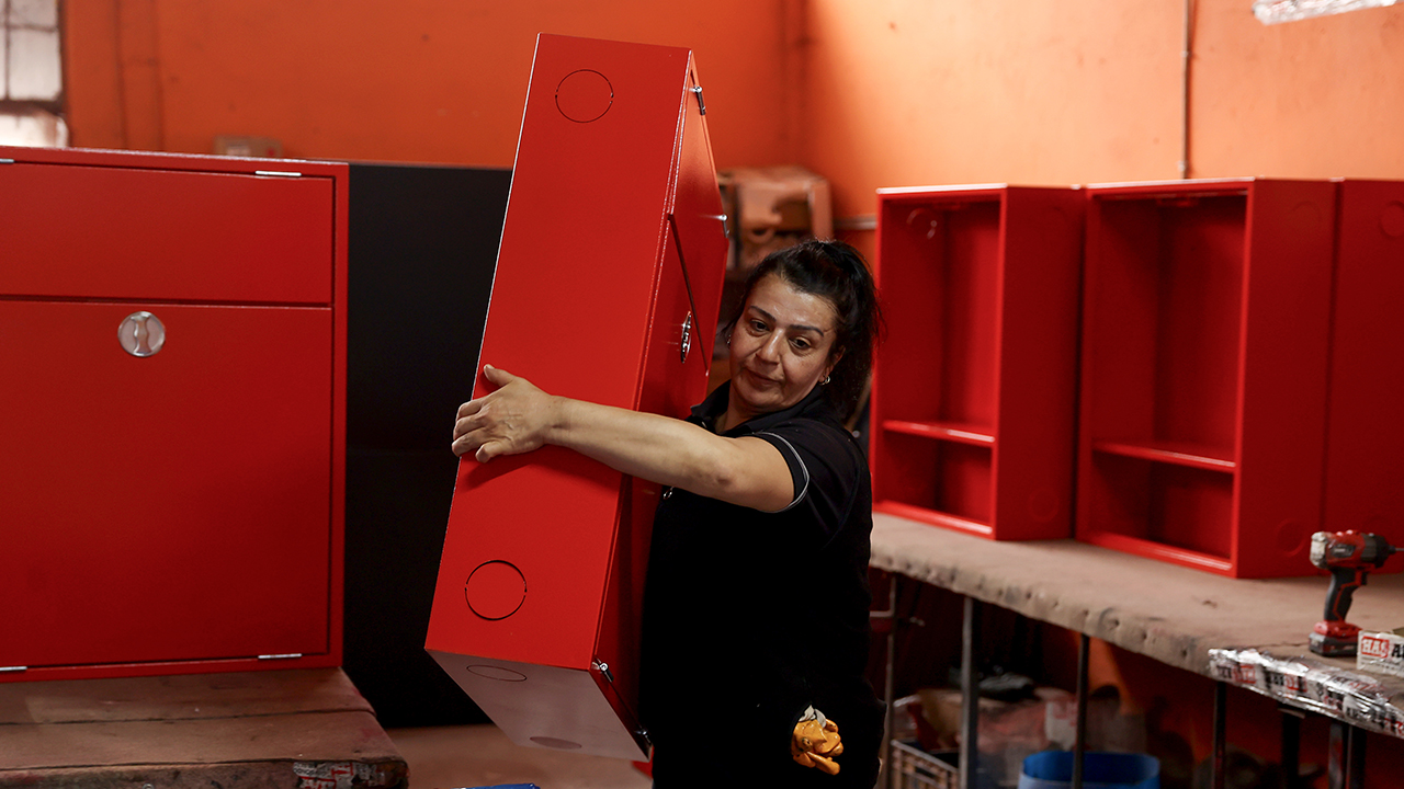 Konya'nın Seydişehir ilçesinde yangın dolabı imal edilen atölyede çalışan üç kadın, üretimin her aşamasında görev almaya çalışıyor.