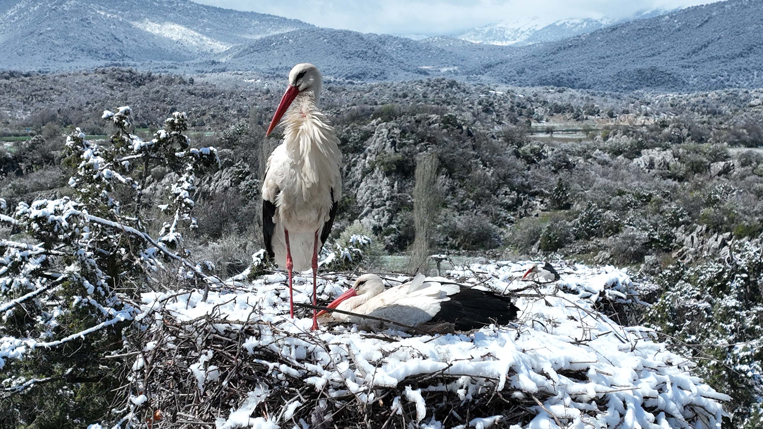 Mart ayının son günlerinde kar yağması üzerine leylekler de beslenmekte sorun yaşayınca belediye ekipleri ve doğaseverler yiyecek bıraktı.