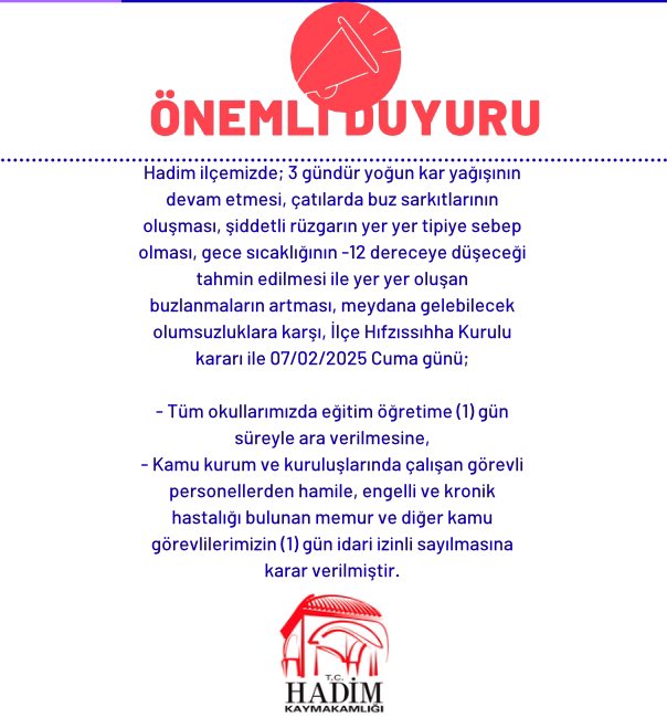 Ayrıca Halkapınar, Hadim, Taşkent, Güneysınır ve Derebucak ilçesinde tüm okullarda elverişsiz hava koşulları nedeniyle yaşanabilecek olumsuzluklara karşı önleyici tedbir olarak, İlçe Hıfzıssıhha Kurulları’nın aldığı karar doğrultusunda 07 Şubat 2025 Cuma günü eğitim öğretime 1 gün süreyle ara verildi.