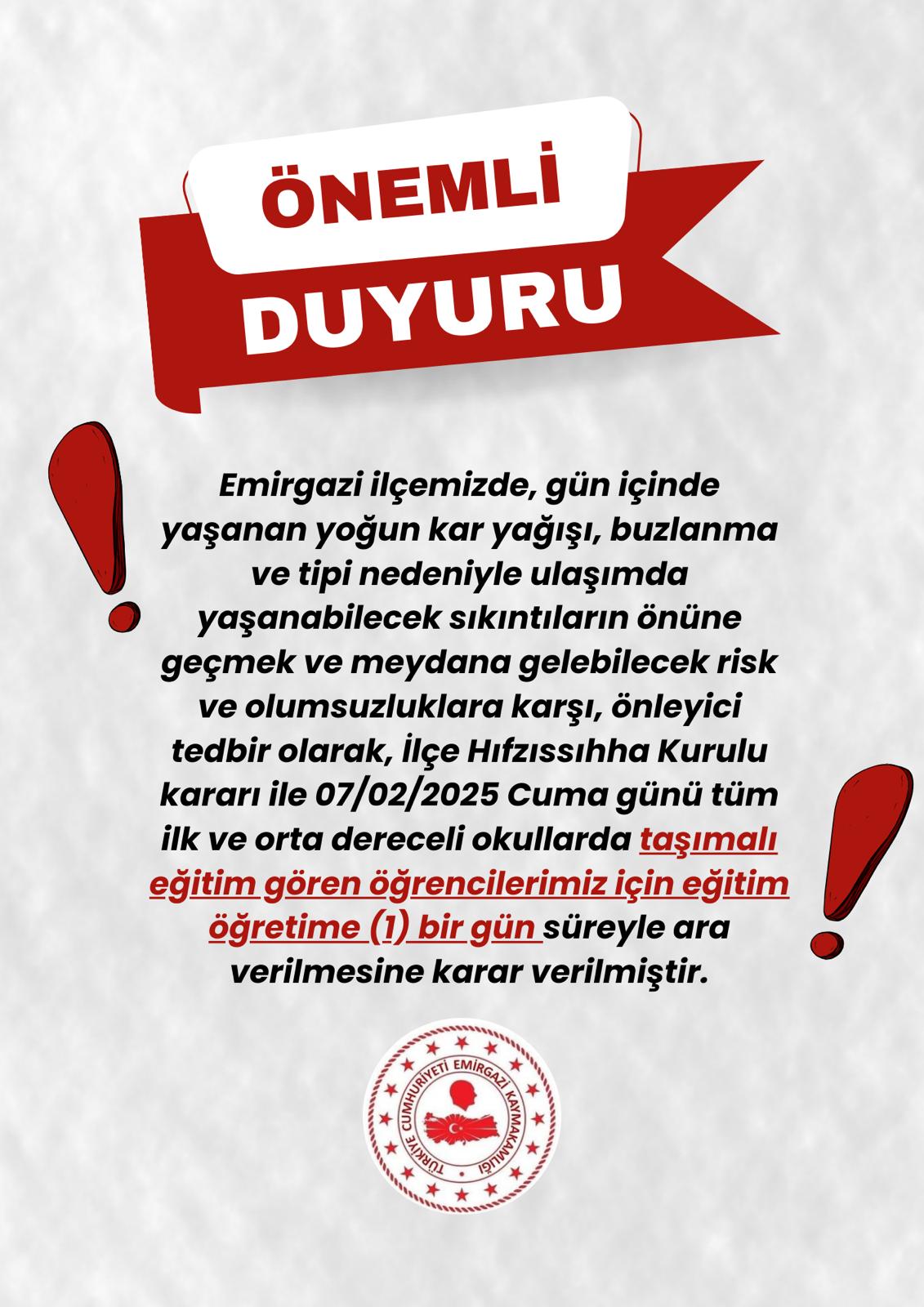 Emirgazi Kaymakamlığı'ndan yapılan açıklamada, "Gün içinde yaşanan yoğun kar yağışı, buzlanma ve tipi nedeniyle ulaşımda yaşanabilecek sıkıntıların önüne geçmek ve meydana gelebilecek risk ve olumsuzluklara karşı, önleyici tedbir olarak, İlçe Hıfzıssıhha Kurulu kararı ile 7 Şubat 2025 Cuma günü ilk ve orta dereceli okullarda taşımalı eğitim gören öğrencilerimiz için eğitim öğretime 1 gün süre ile arar verilmesine karar verilmiştir." ifadeleri kullanıldı.