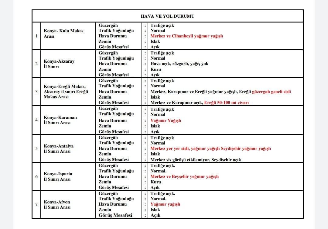 Konya İl Emniyet Müdürlüğü, karayollarının durumunu paylaştı. Yapılan paylaşımda, Merkez, Cihanbeyli, Ereğli, Seydişehir, Beyşehir ilçelerinde yağmur yağışı etkisi var. Konya-Aksaray il sınırı ve Konya-Isparta sınırlarında yağmur yağışı gözükmemekle birlikte yollar da trafiğe açık olmakla birlikte yoğunluk normal seyirde.