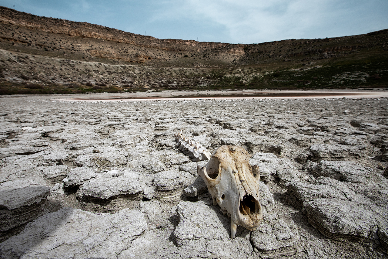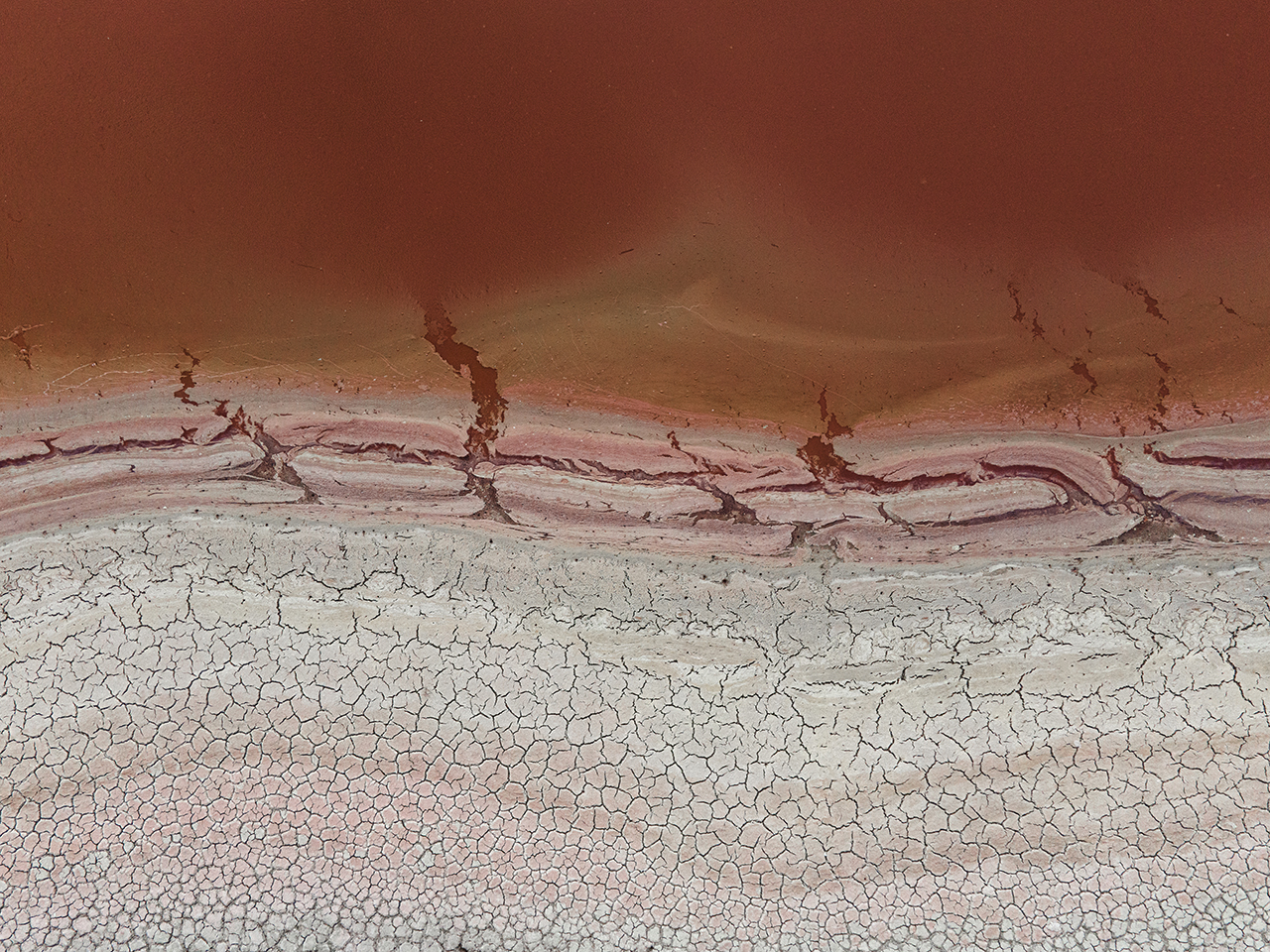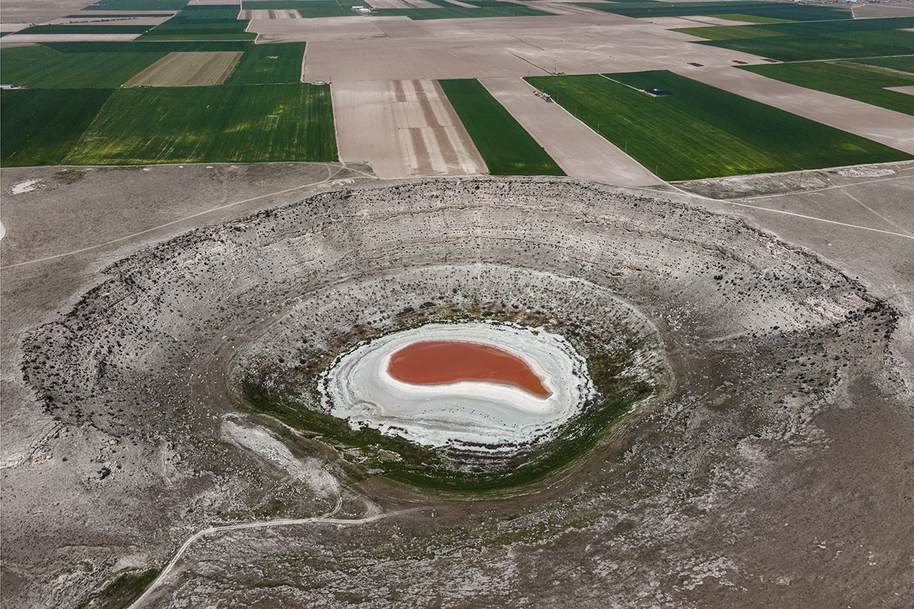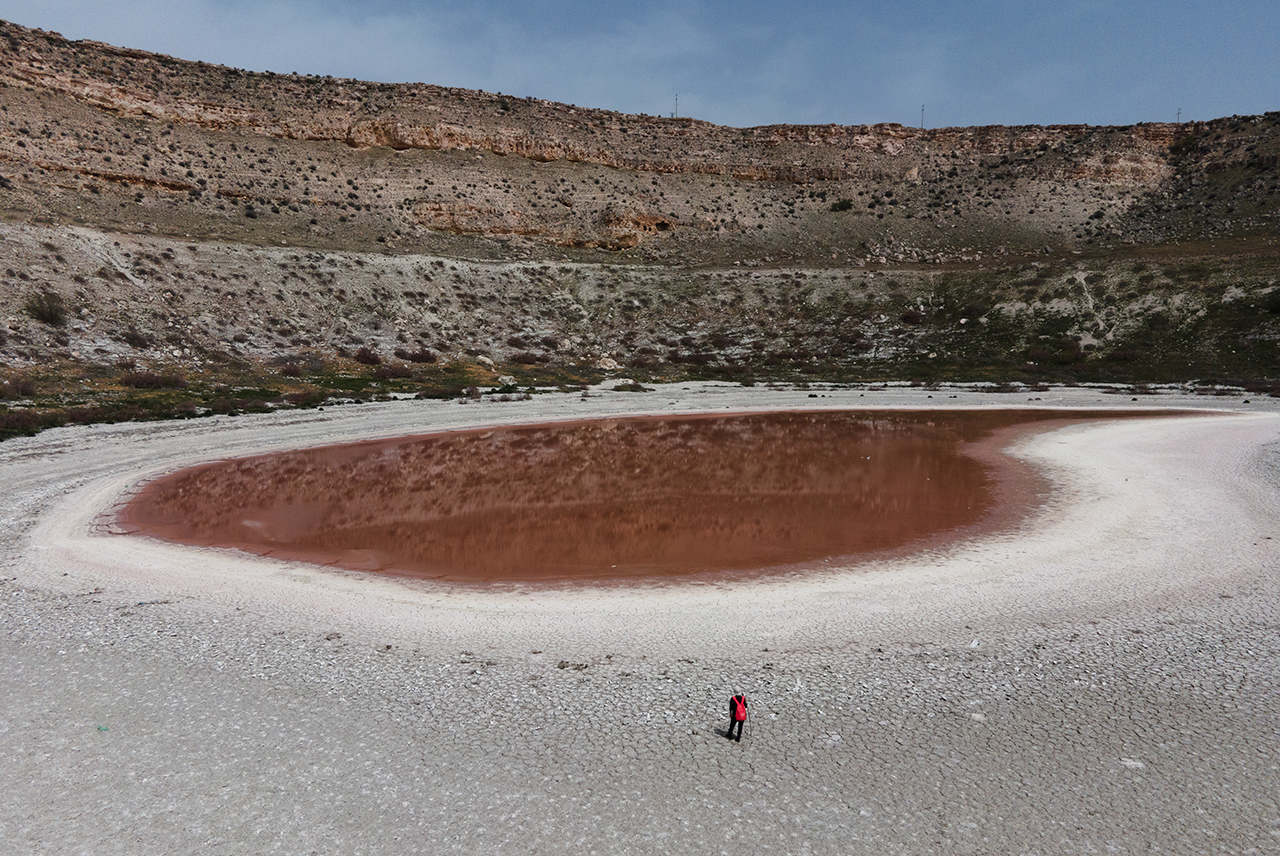 Konya’nın Karapınar ilçesinde bulunan ve son yıllarda su seviyesi azaldığı Meyil Obruk Gölü kızıl renge büründü.