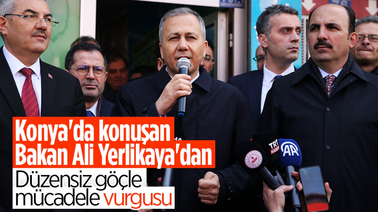 Memleketi Konya'ya gelen İçişleri Bakanı Ali Yerlikaya, gece gündüz demeden terör örgütü PKK başta olmak üzere bütün terör örgütlerine göz açtırmadıklarını, nefeslerini kesip, etkisiz hale getirmekte kararlı olduklarını söyledi. Düzensiz göçle mücadele vurgusu da yapan Bakan Yerlikaya, "Geldiğimiz günden beri düzensiz göçmen kaçakçılığı organizatörlerine de nefes aldırmıyoruz" dedi.