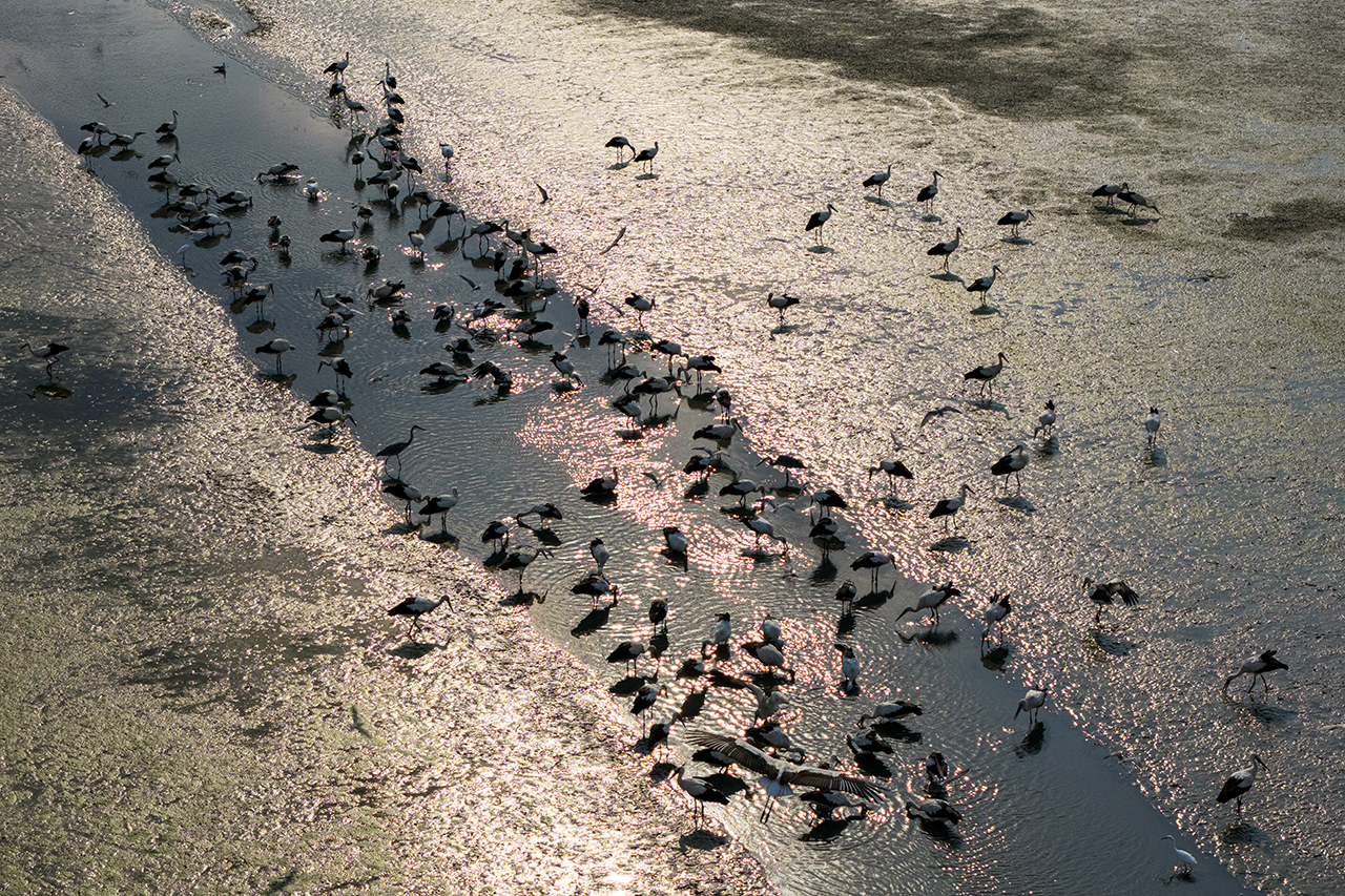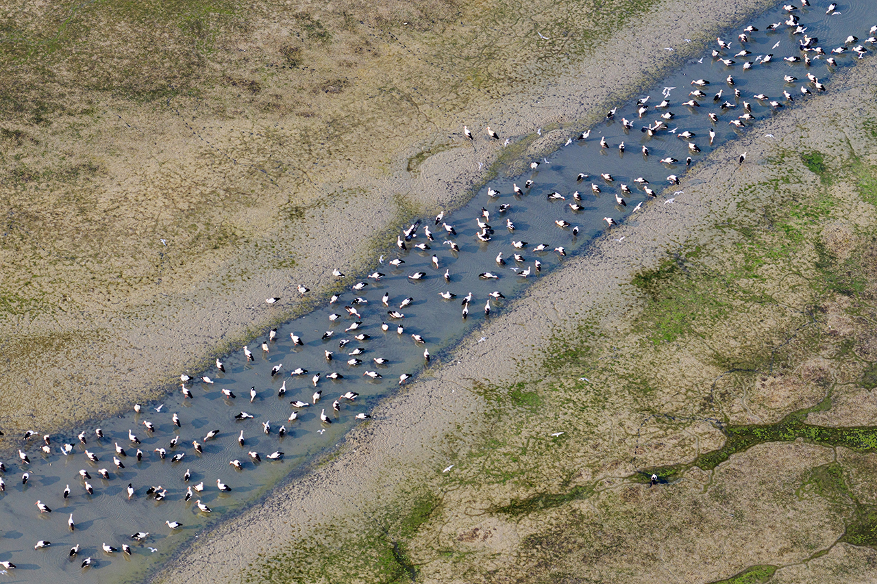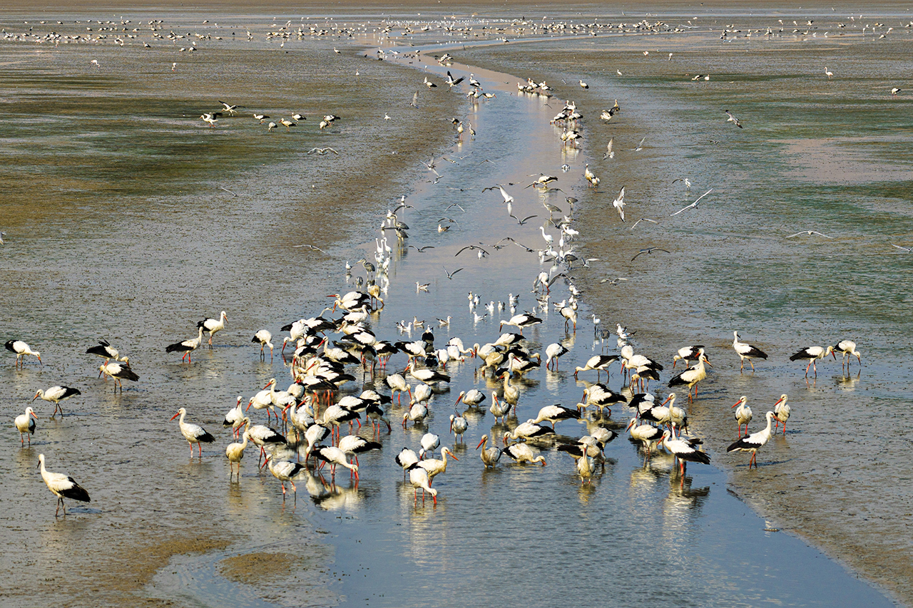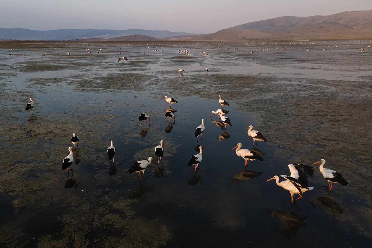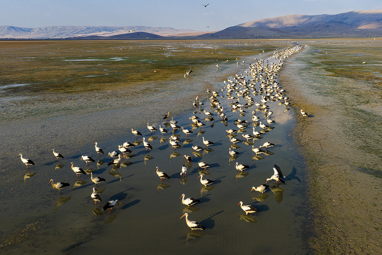 Avrupa’dan Afrika’ya uzanan uzun ve zorlu göç yolculuklarında gölde mola veren leylekler, burada sığ sularda beslenip dinlenerek yollarına devam ediyor.