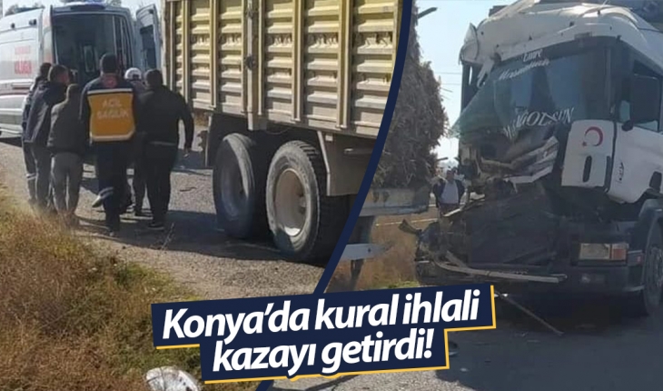 Konya'nın Çumra ilçesinde bir kamyon aynı yöndeki kamyona arkadan çarptı. Çarpmanın şiddetiyle yüklü saman balyaları karayoluna savruldu.
