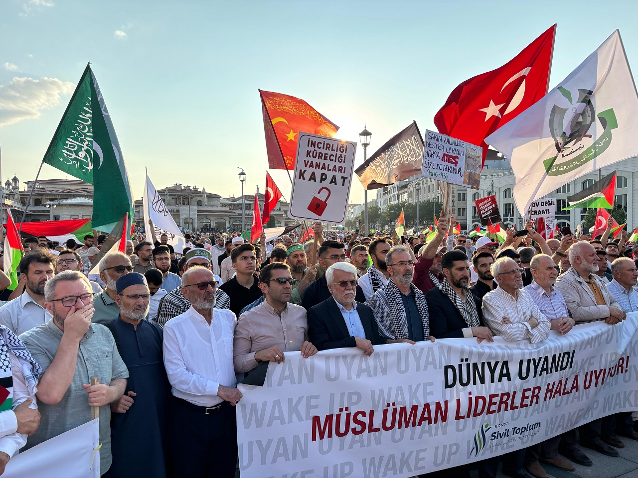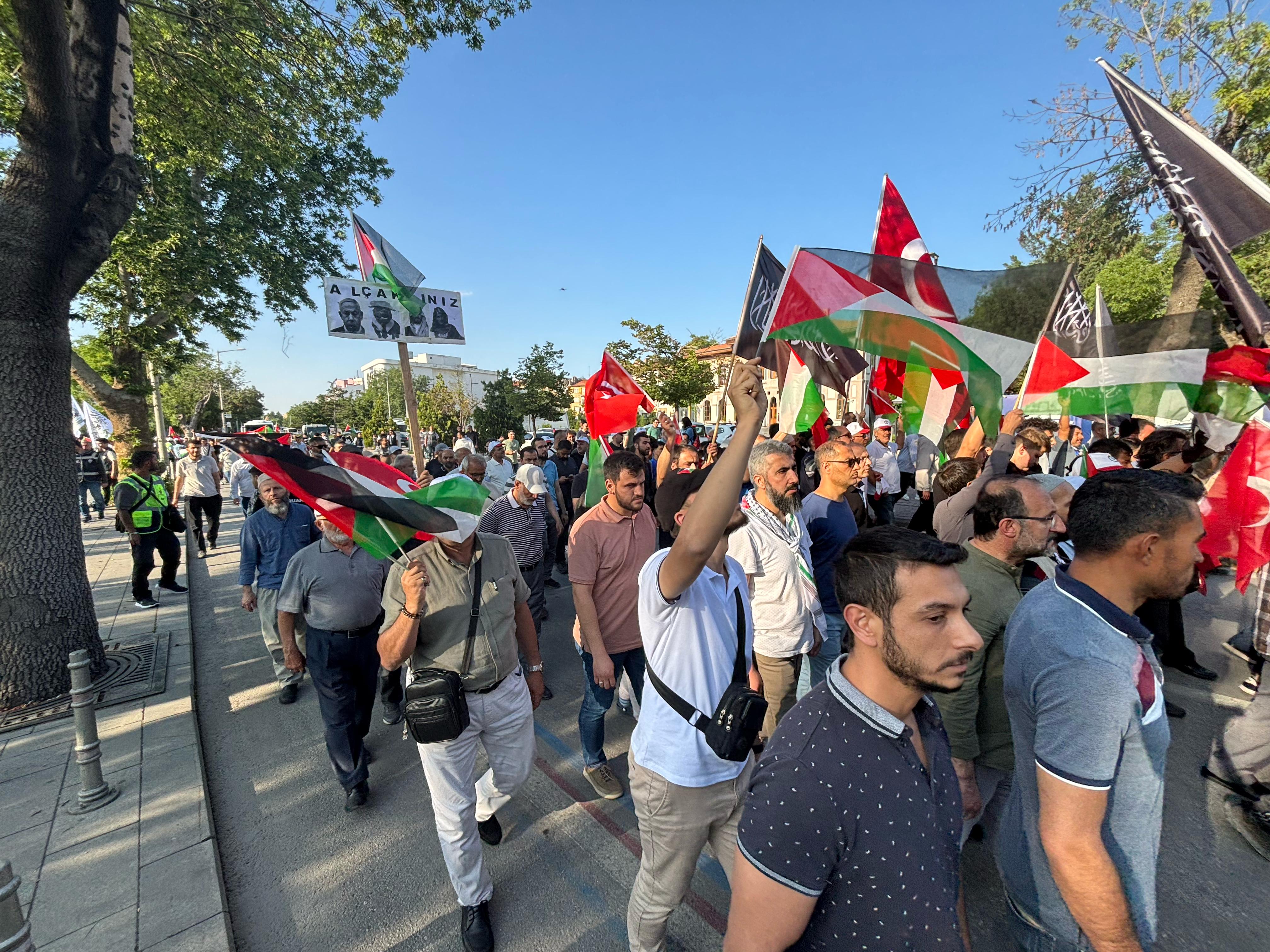 Katılımcılar, Kılıçarslan Meydanı’nda bir araya gelerek, Kur’an-ı Kerim tilavetinin ardından tekbirler ve sloganlar eşliğinde Alaaddin Bulvarı üzerinden Mevlana Meydanı’na yürüdü. “Cenk, Cihat, Şahadet”, “Nehirden denize özgür Filistin”, “Aksa sana canım feda”, “Boykota devam direnişe selam” gibi sloganların atıldığı yürüyüş, büyük bir katılımla gerçekleşti.