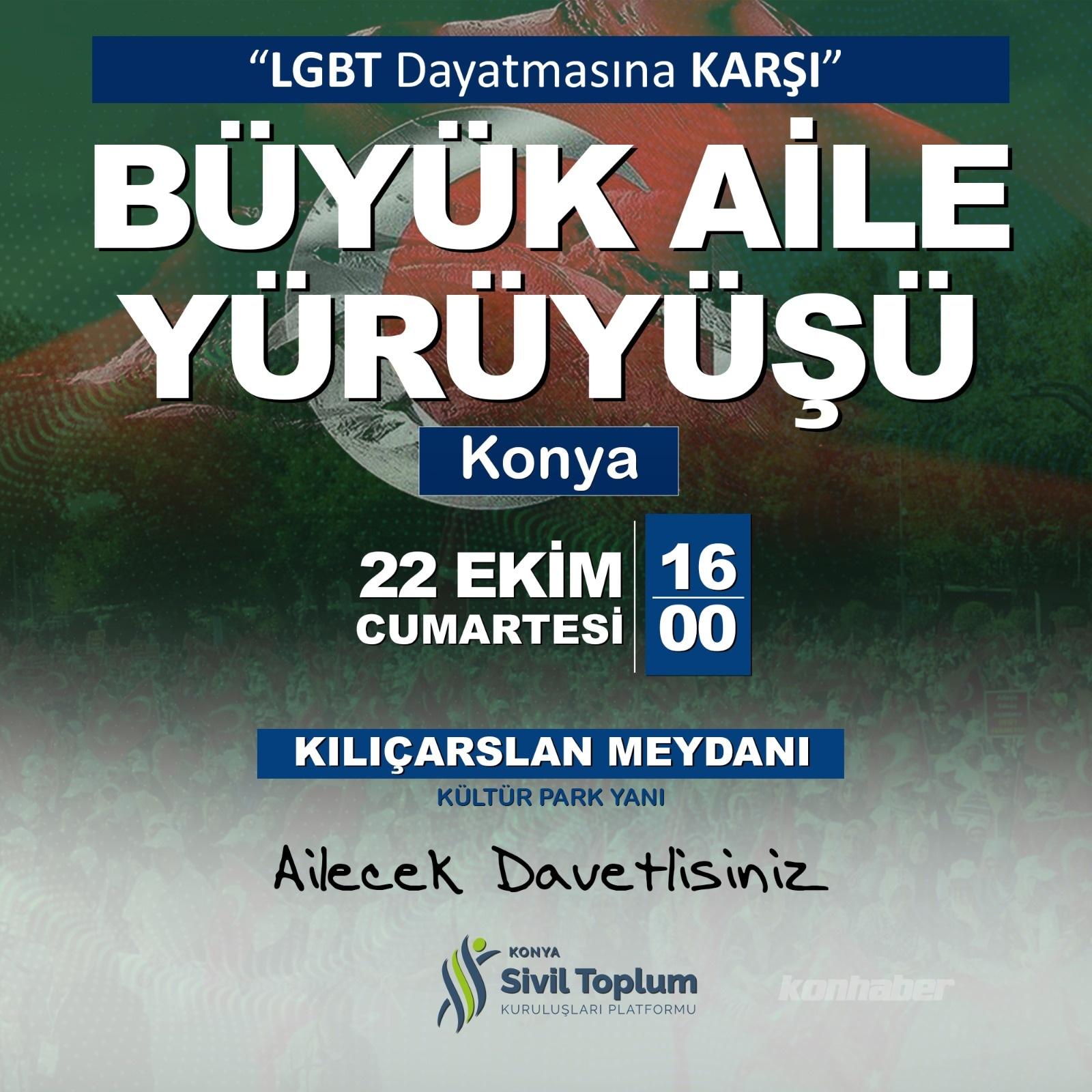 Küresel bir dayatma halini alan LGBT sapkınlığına karşı duyarlı insanlar Türkiye’nin dört bir yanında meydanlara iniyor. Konya’da 22 Ekim Cumartesi günü saat 16.00’da Kılıçarslan Meydanı’nda ‘Büyük Aile Yürüyüşü’ gerçekleştirilecek.