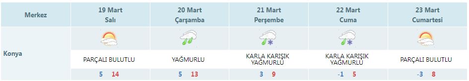 Meteoroloji Genel Müdürlüğü'nden alınan bilgilere göre Konya için 5 günlük hava durumu tahmini: Bugün için Konya hava durumu Parçalı Bulutlu, sıcaklık 14°. Yarın için Konya hava durumu yağmurlu, sıcaklık 13°. 21 Mart 2024 Perşembe Konya hava durumu Karla karışık yağmurlu, sıcaklık 9°. 22 Mart 2024 Cuma Konya hava durumu Karla Karışık Yağmur, sıcaklık 5°. 23 Mart 2024 Cumartesi Konya hava durumu Parçalı Bulutlu, sıcaklık 8°.