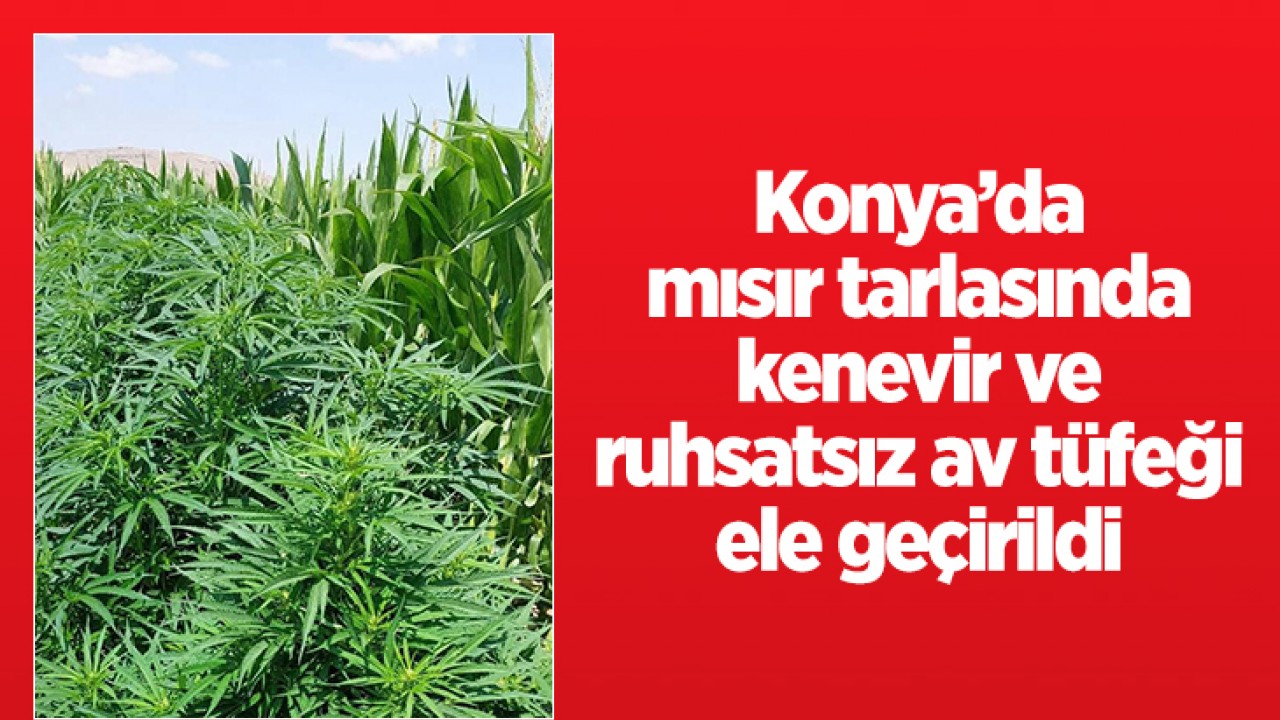 Konya'nın Kulu ilçesinde mısır ekili tarlada kenevir ve ruhsatsız av tüfeği ele geçirildi. Tarla sahibi gözaltına alındı.
