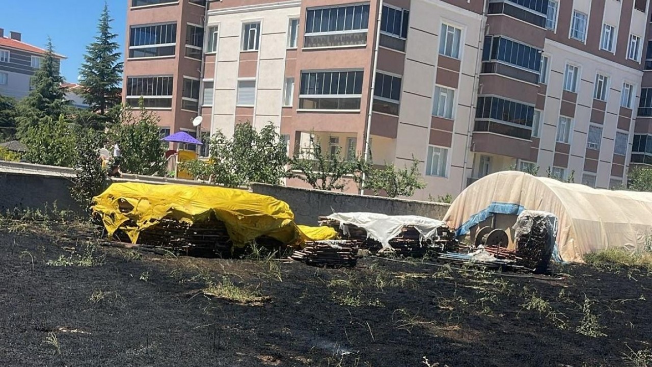 Yangında çadır, inşaat malzemeleri ve borular yanarak zarar gördü. (Ertan Özkök)