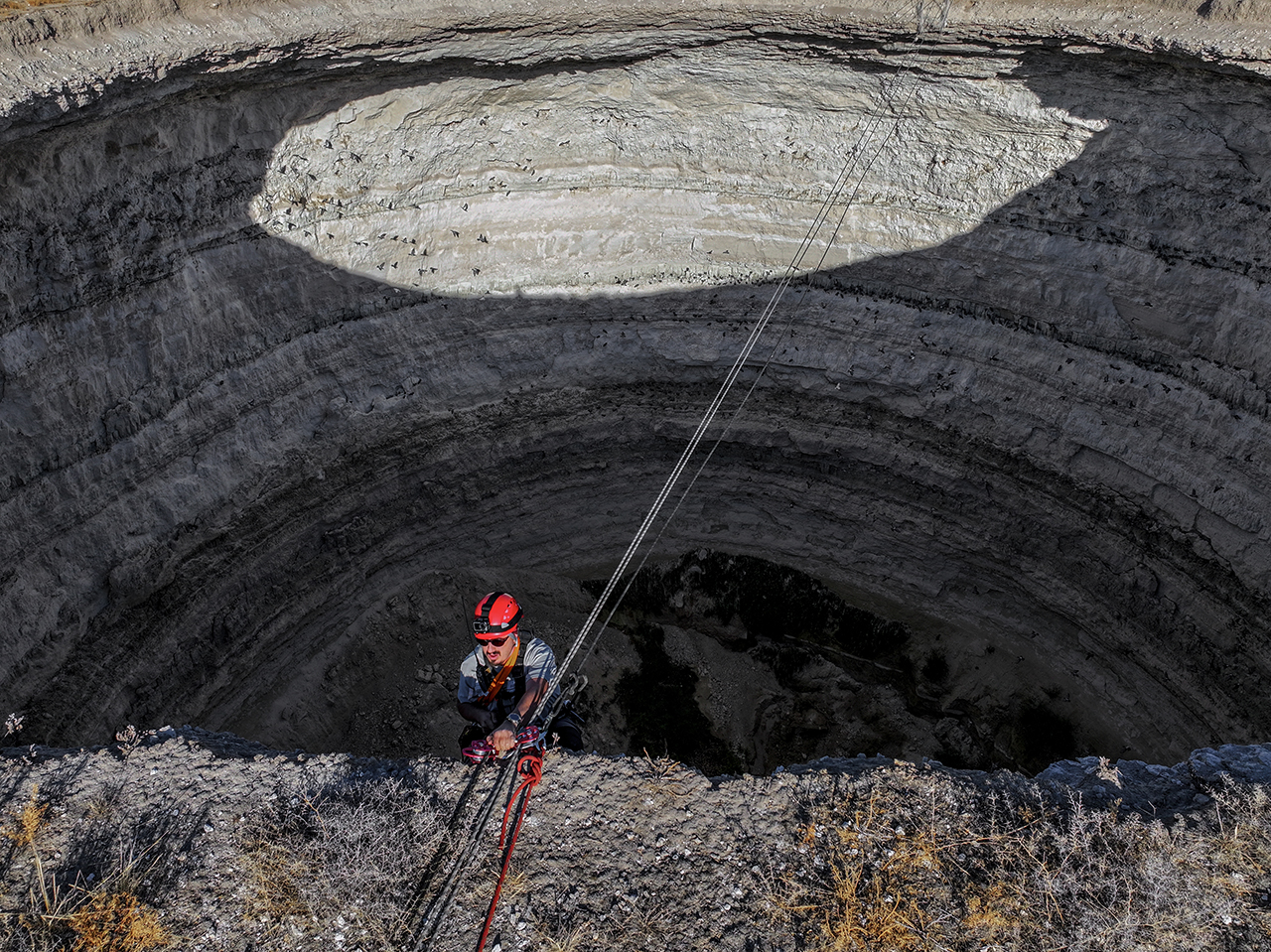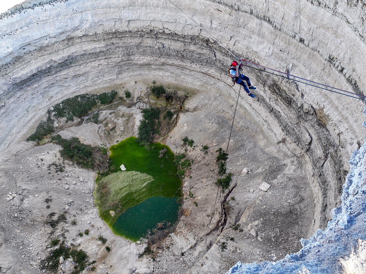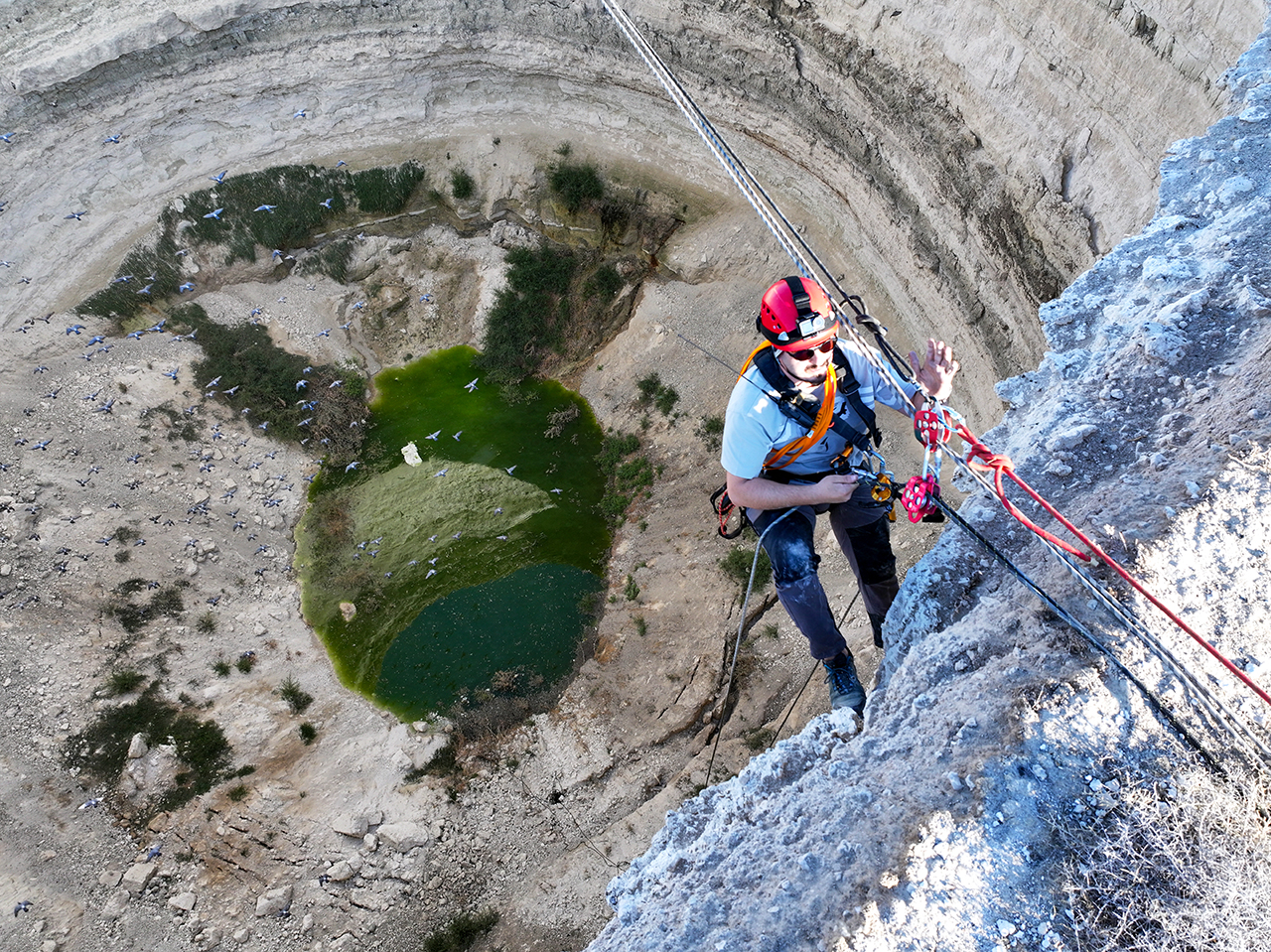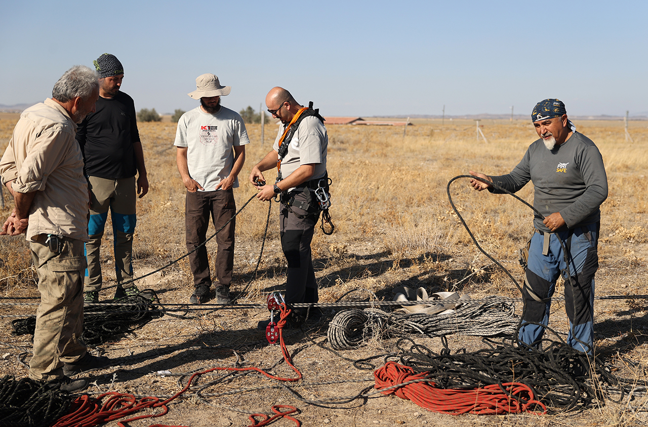 Aynı zamanda "iple erişim" uzmanı ekip üyeleri 45 metre çaptaki obruk üzerinde emniyet halatları kurup yaklaşık 40 metre derinliğe indi. Ekip üyeleri, yüzlerce kuşun yuva yaptığı obruğun dip kısmından gökyüzünü izledi.
