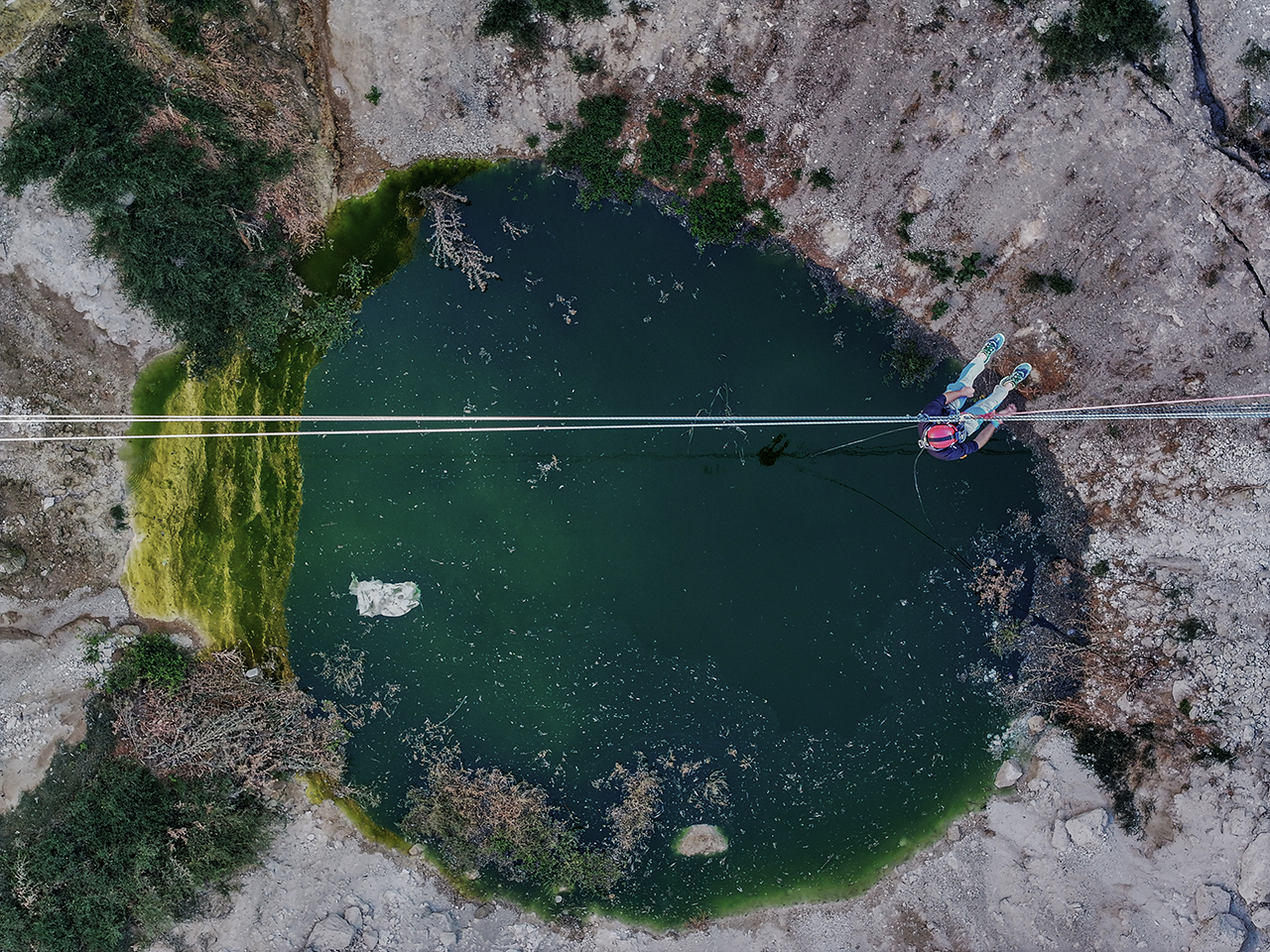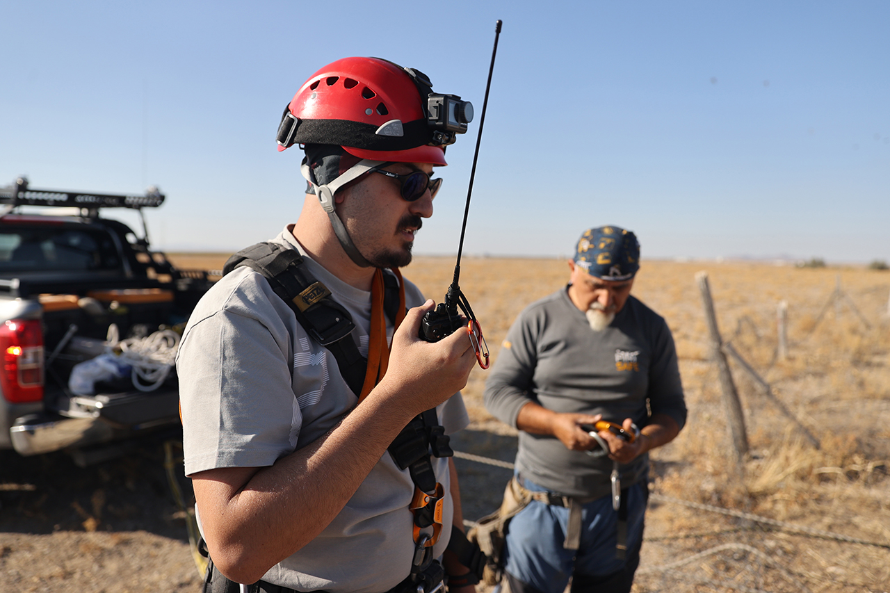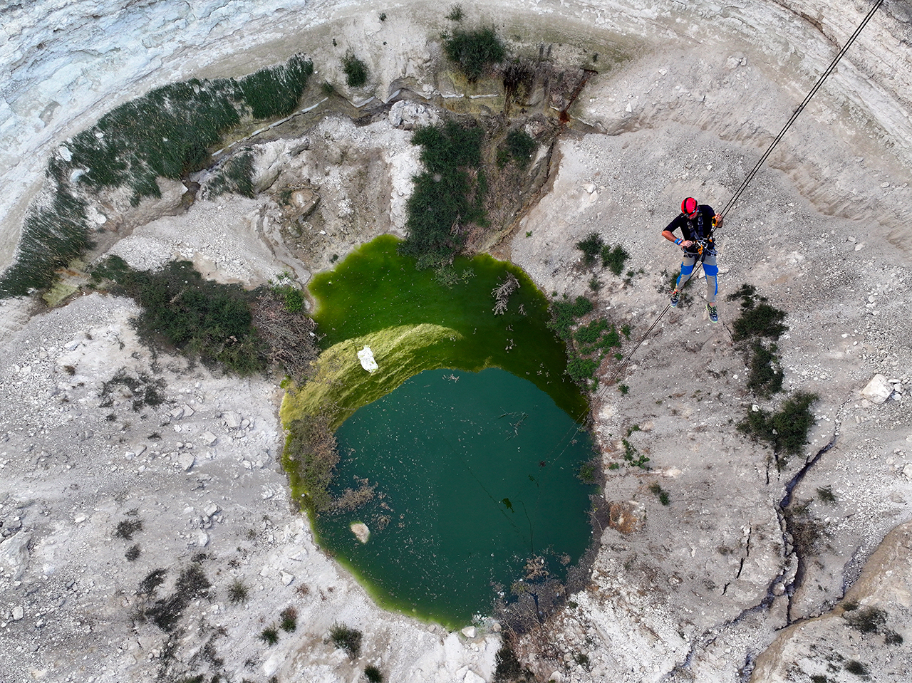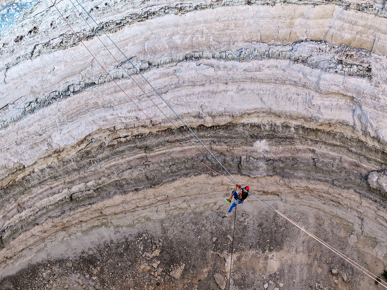Aynı zamanda "iple erişim" uzmanı ekip üyeleri 45 metre çaptaki obruk üzerinde emniyet halatları kurup yaklaşık 40 metre derinliğe indi. Ekip üyeleri, yüzlerce kuşun yuva yaptığı obruğun dip kısmından gökyüzünü izledi.
