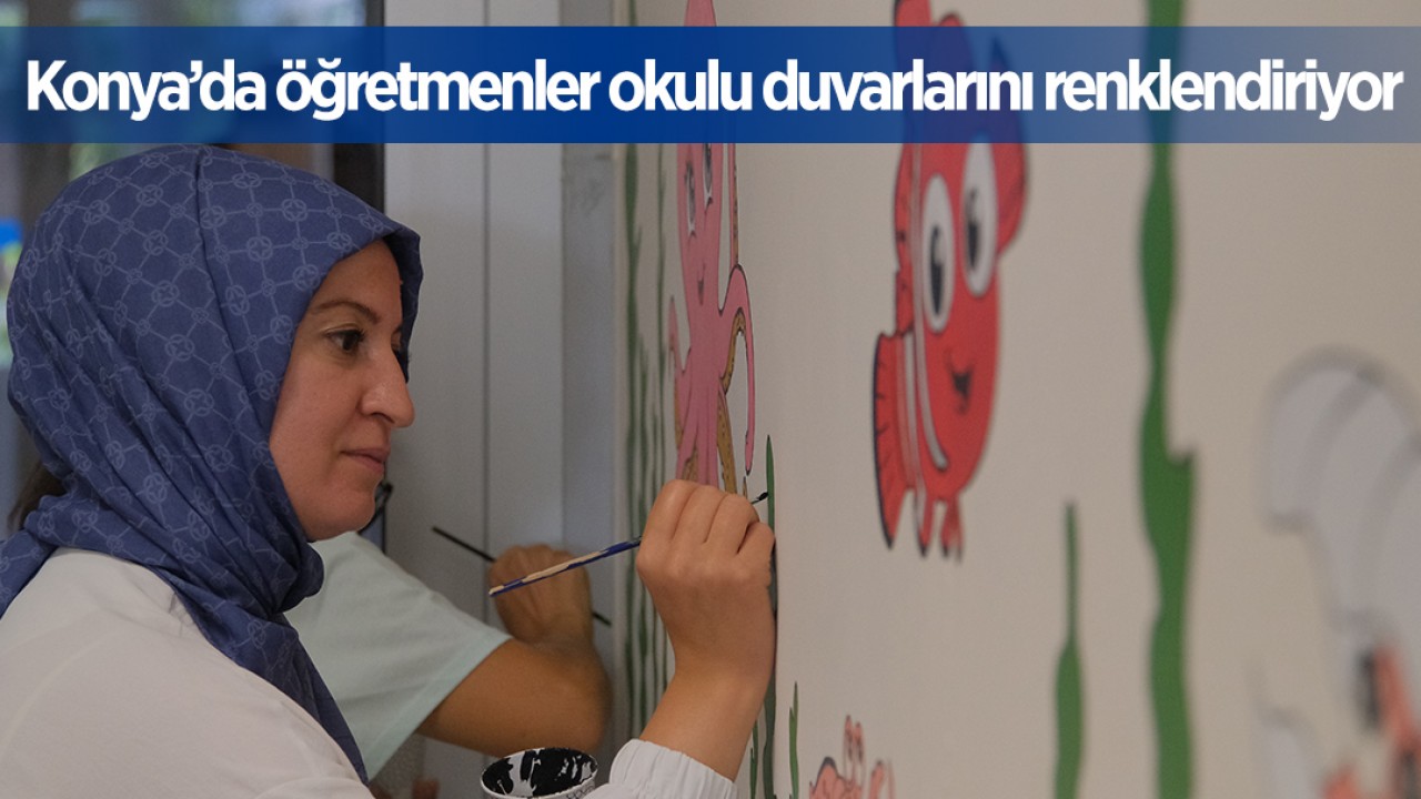 Konya'nın Karapınar ilçesinde bir grup öğretmen, okul duvarlarına görsel tasarımlar yapıyor.