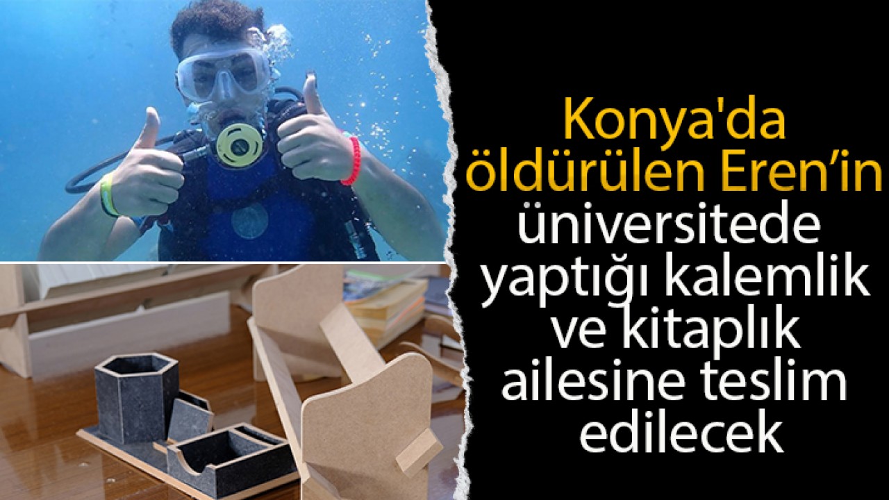 Konya'da harçlığını çıkarabilmek için hafta sonları taksicilik yapan ve trafikte ‘yol verme’ kavgasında bıçaklanarak öldürülen Eren Peker’den (20) geriye, üniversitede uygulamalı derste yaptığı kitaplık ve kalemlik kaldı. Eren’in el emeği ürünleri ailesine teslim edilecek. Öğretim Görevlisi Dr. Mustafa Muslu, “Eren uygulamalı derste en son bu kitaplığı ve kalemliği yapmıştı. Dönem sonu notundan sonra götürürsünüz demiştik ama nasip olmadı. Ailesine bunları ulaştırıp, Eren’in son yaptığı ürünler diye kendisinden hatıra kalmasını istiyoruz” dedi.